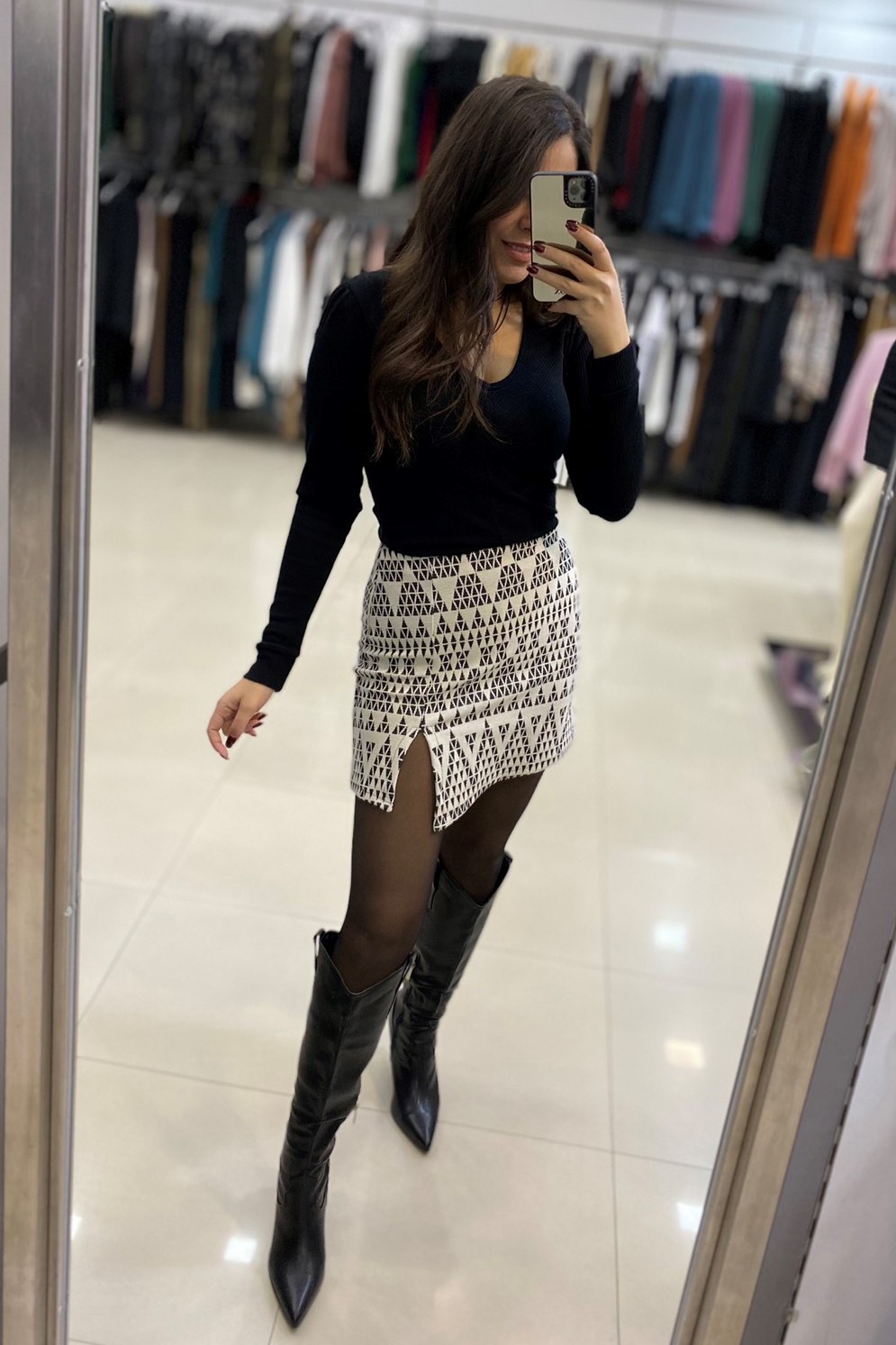 Άνετη γραμμή με σκίσιμο στο μπροστινό μέρος. Φερμουάρ στο πίσω μέρος.