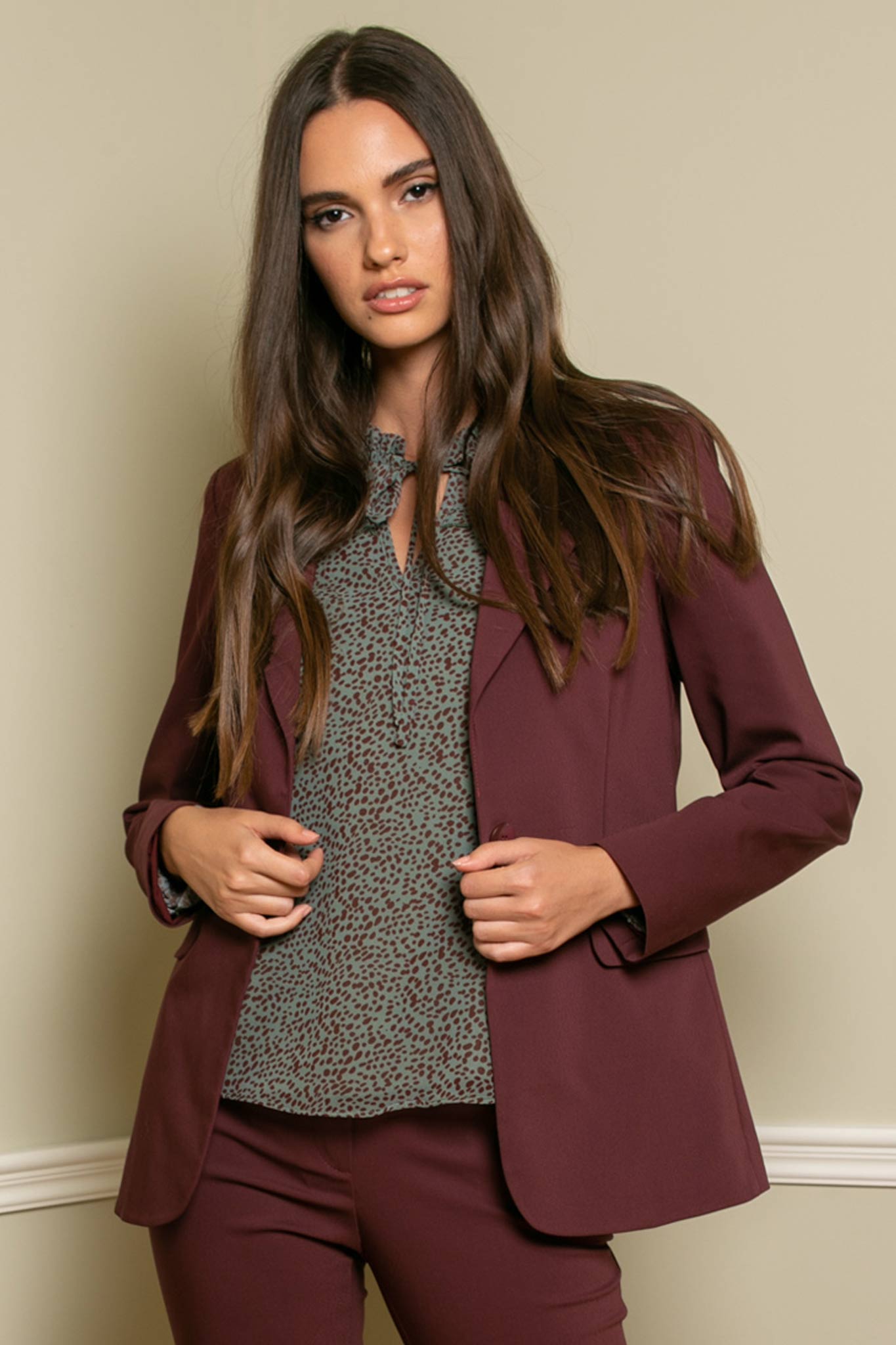 Στενή εφαρμογή με άνετη κίνηση. Γιακά με πέτο και μακρύ μανίκι.