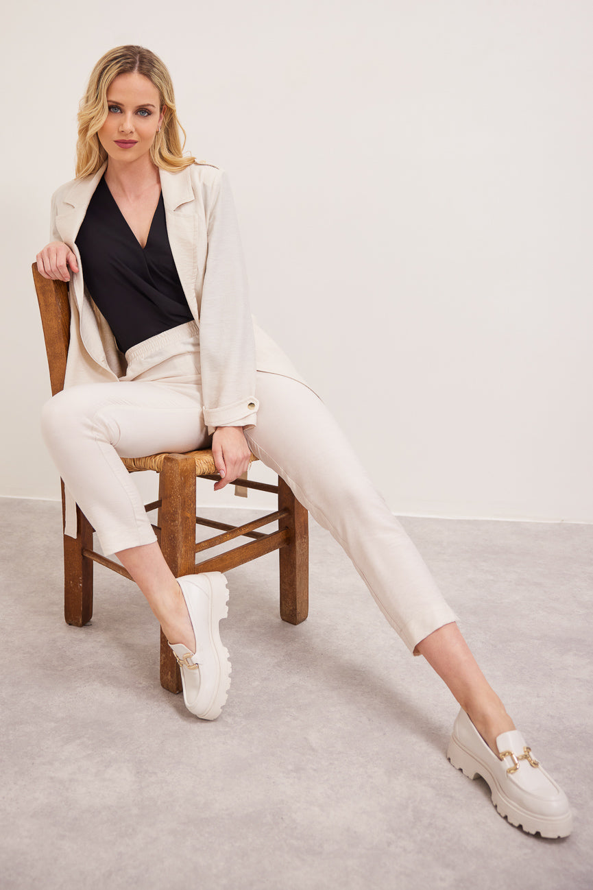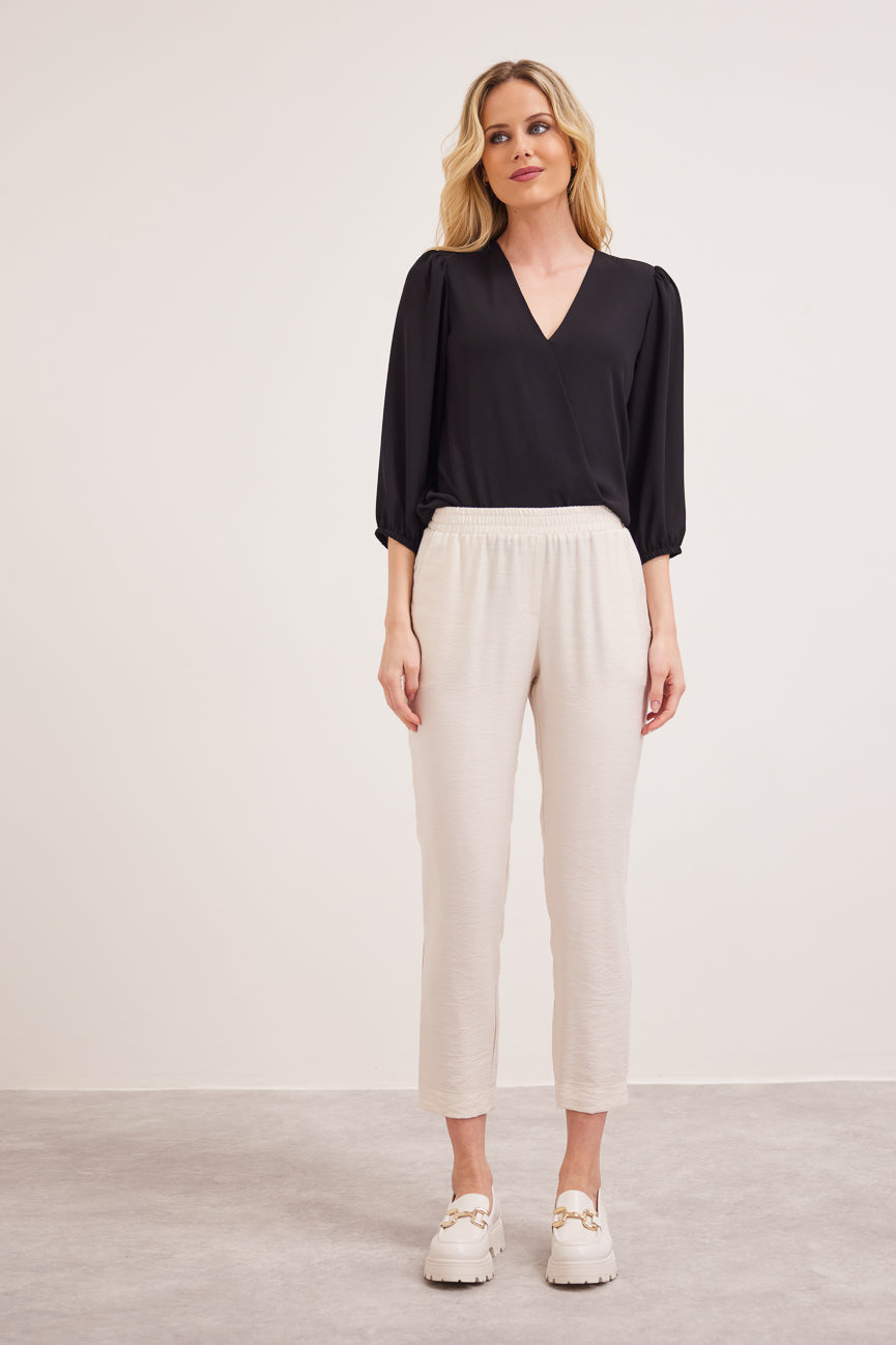 Ίσια γραμμή με άνετη κίνηση. Λάστιχο στη μέση. Τσέπες στο πλάι.