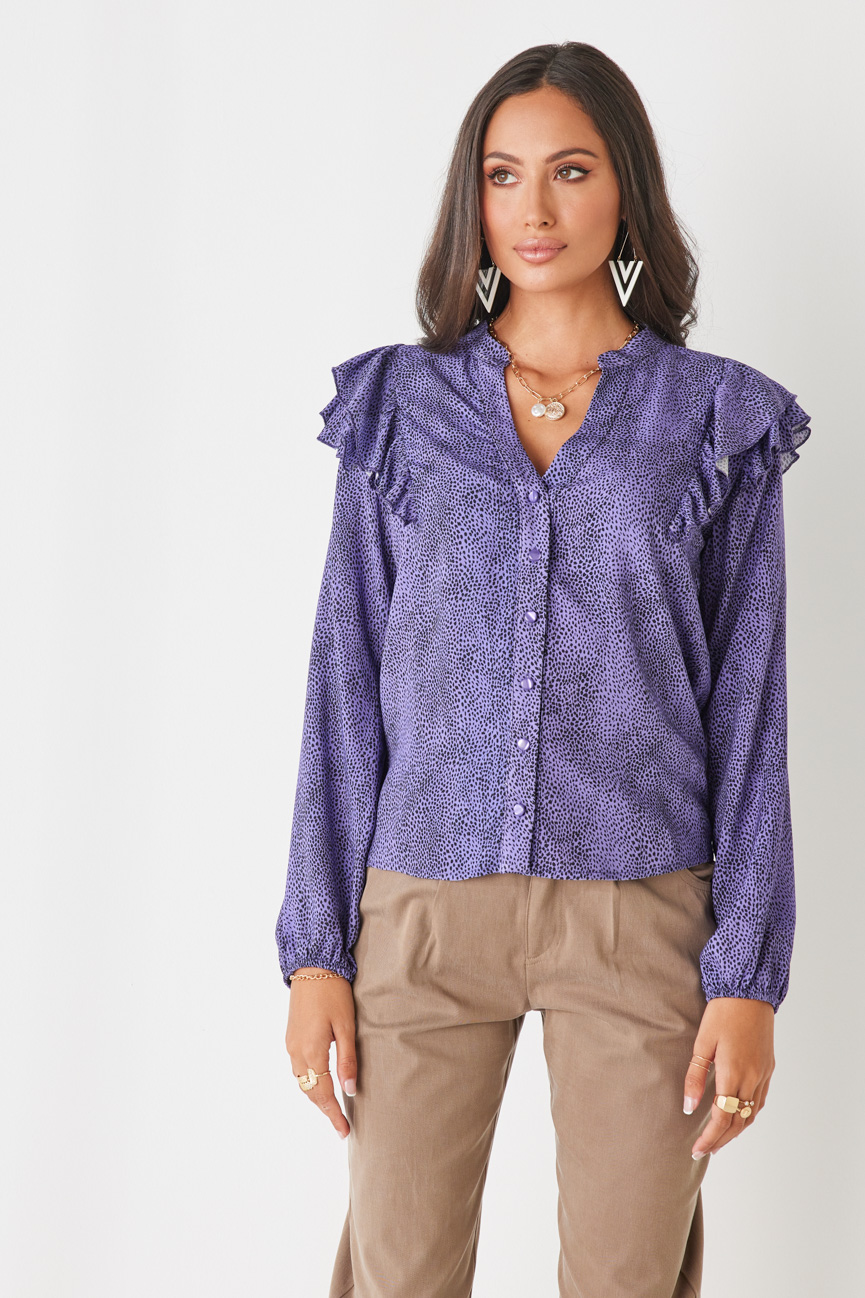 Βολάν στα μανίκια και λάστιχο στον καρπό. Κλείνει με κουμπιά εμπρός.