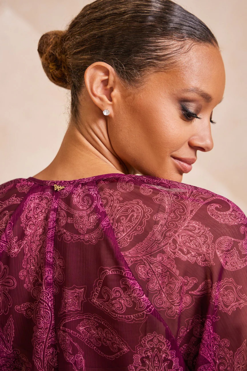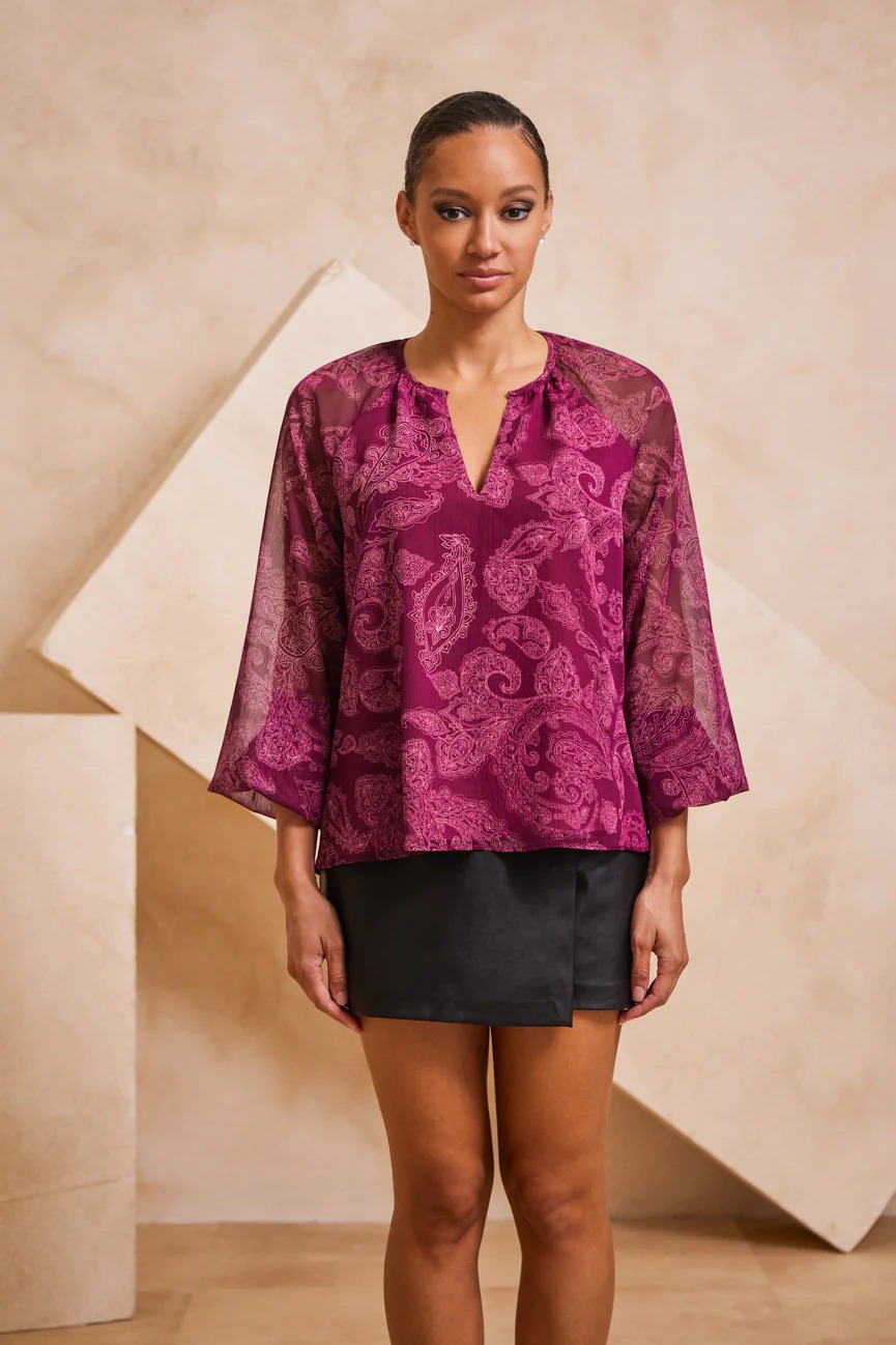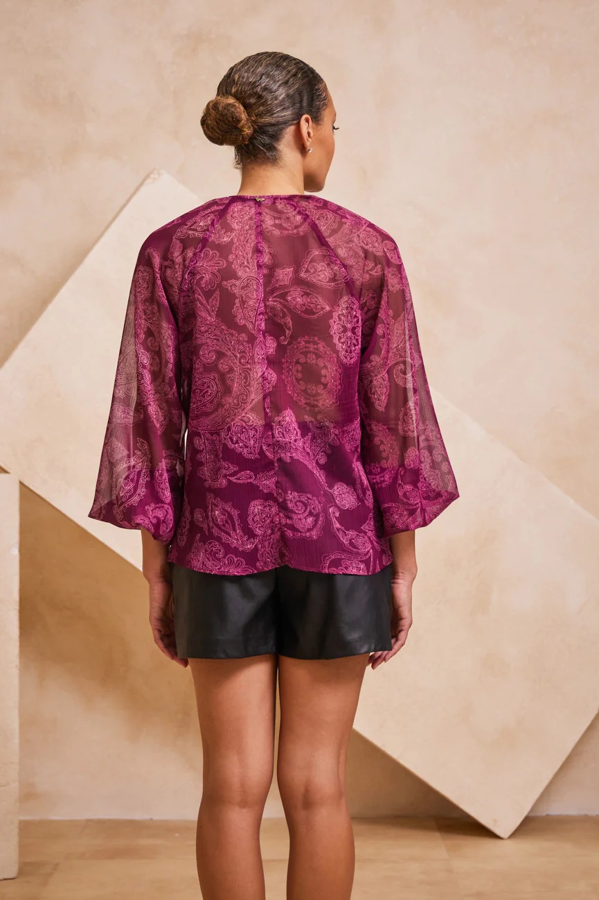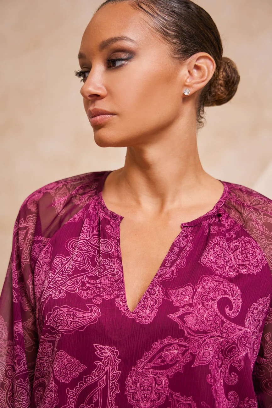 Μπλούζα μακρυμάνικη εμπριμέ. Σταθερό ύφασμα μουσελίνα.