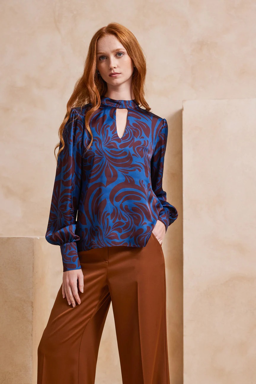 Μπλούζα μακρυμάνικη εμπριμέ. Σταθερό σατέν ύφασμα.