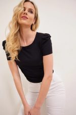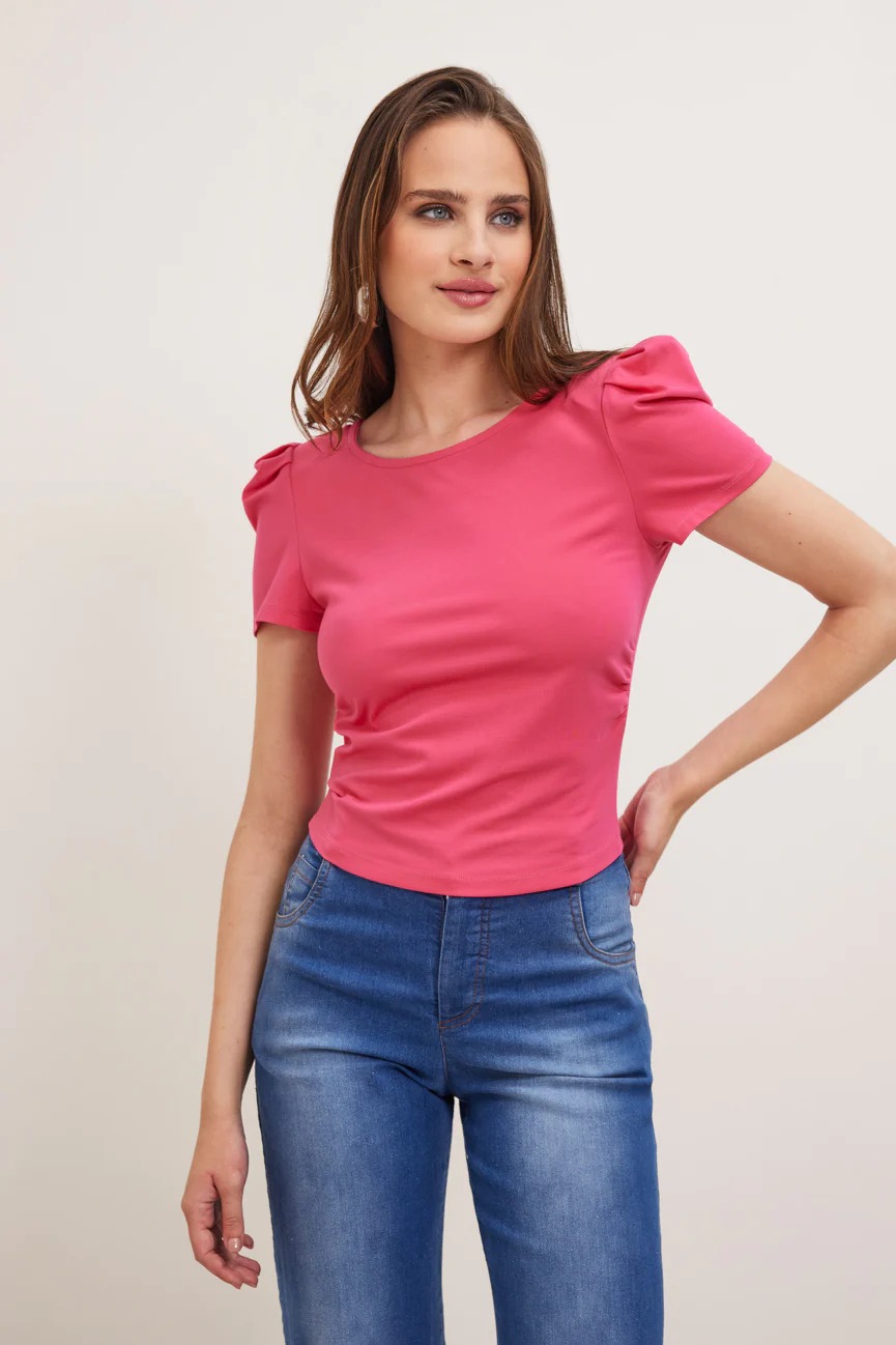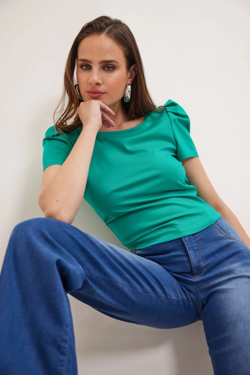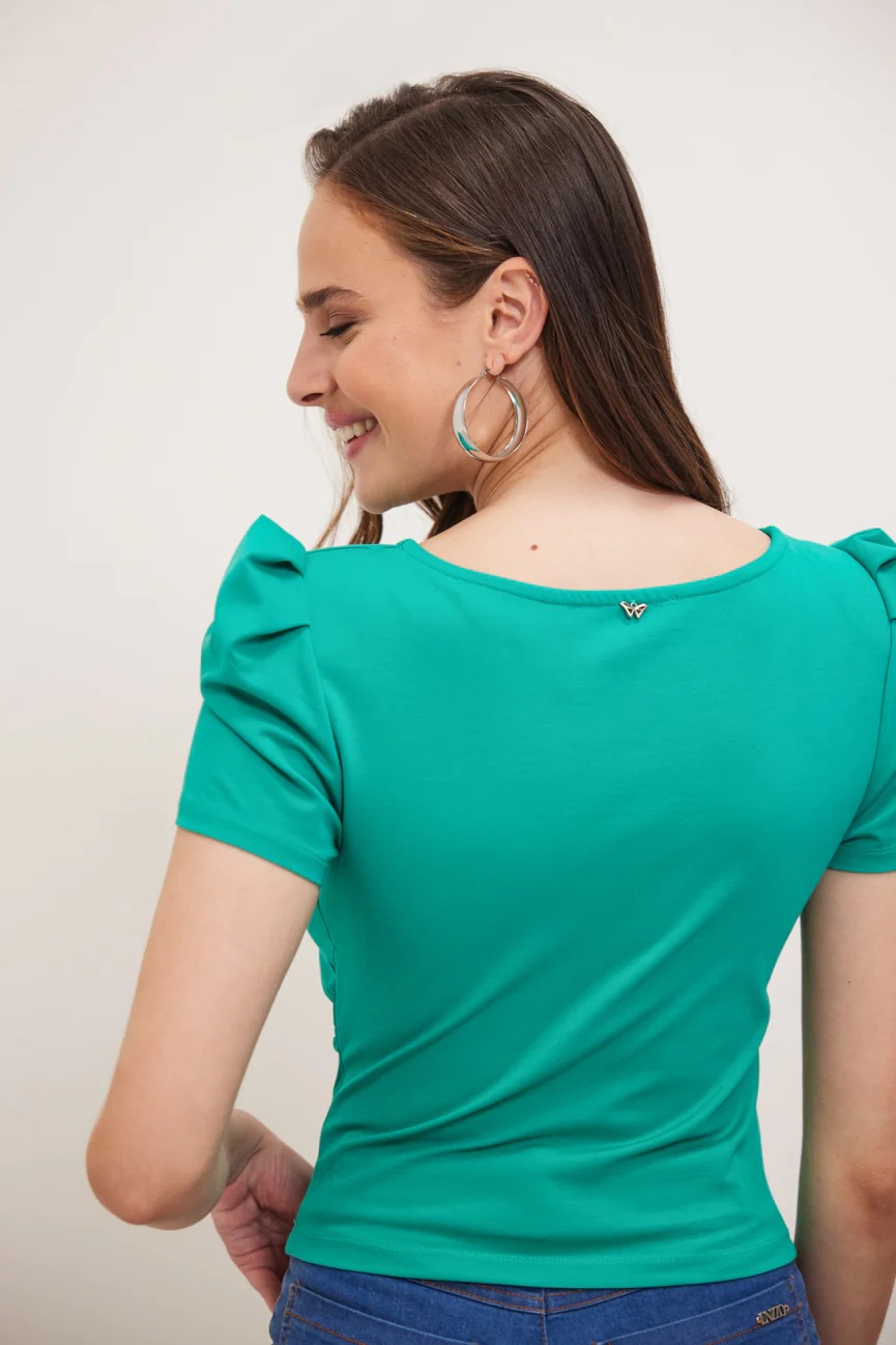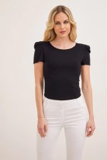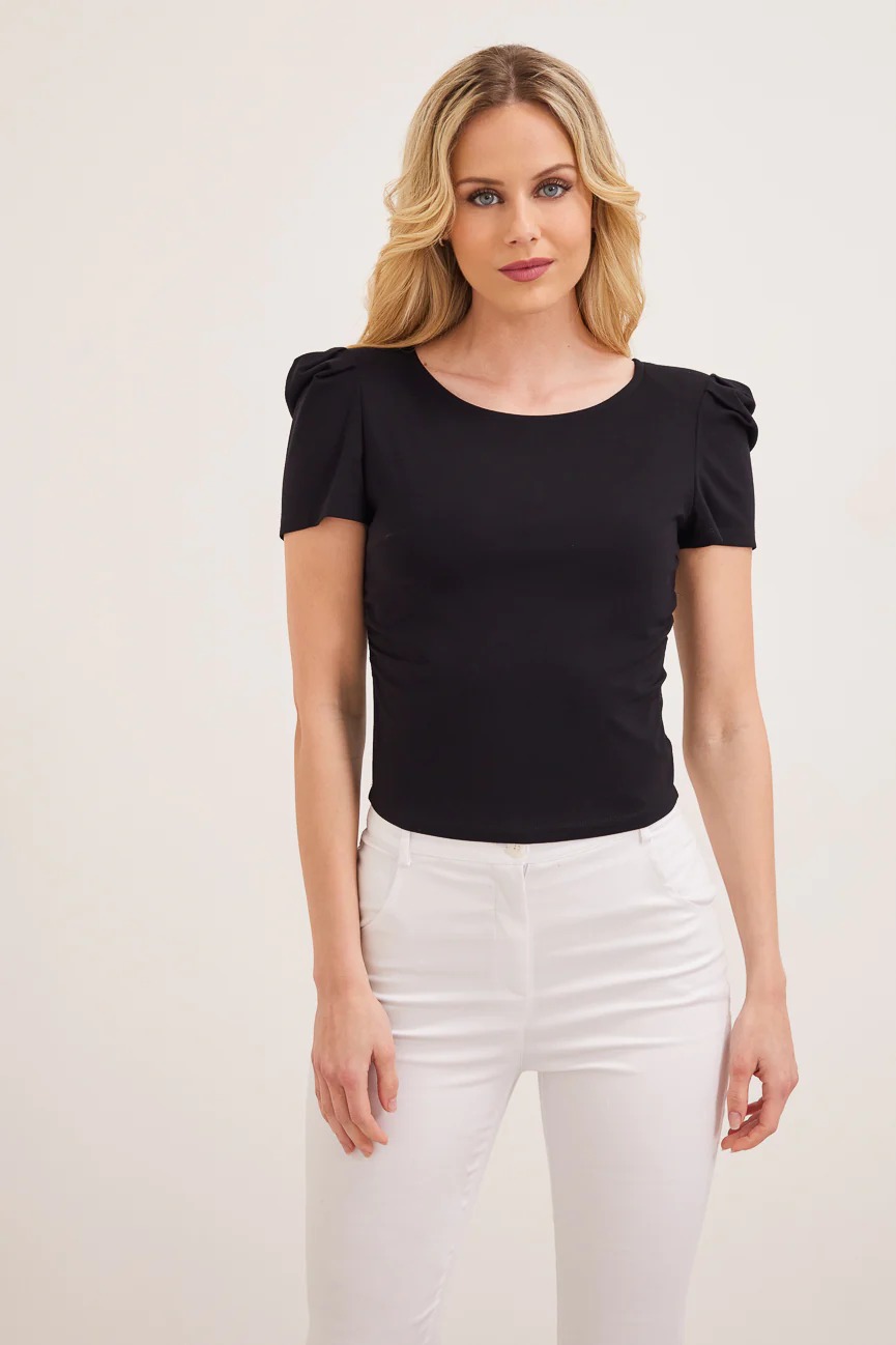 Εφαρμοστό με άνετη κίνηση. Στρογγυλή λαιμόκοψη. Μικρό φούσκωμα στους ώμους.