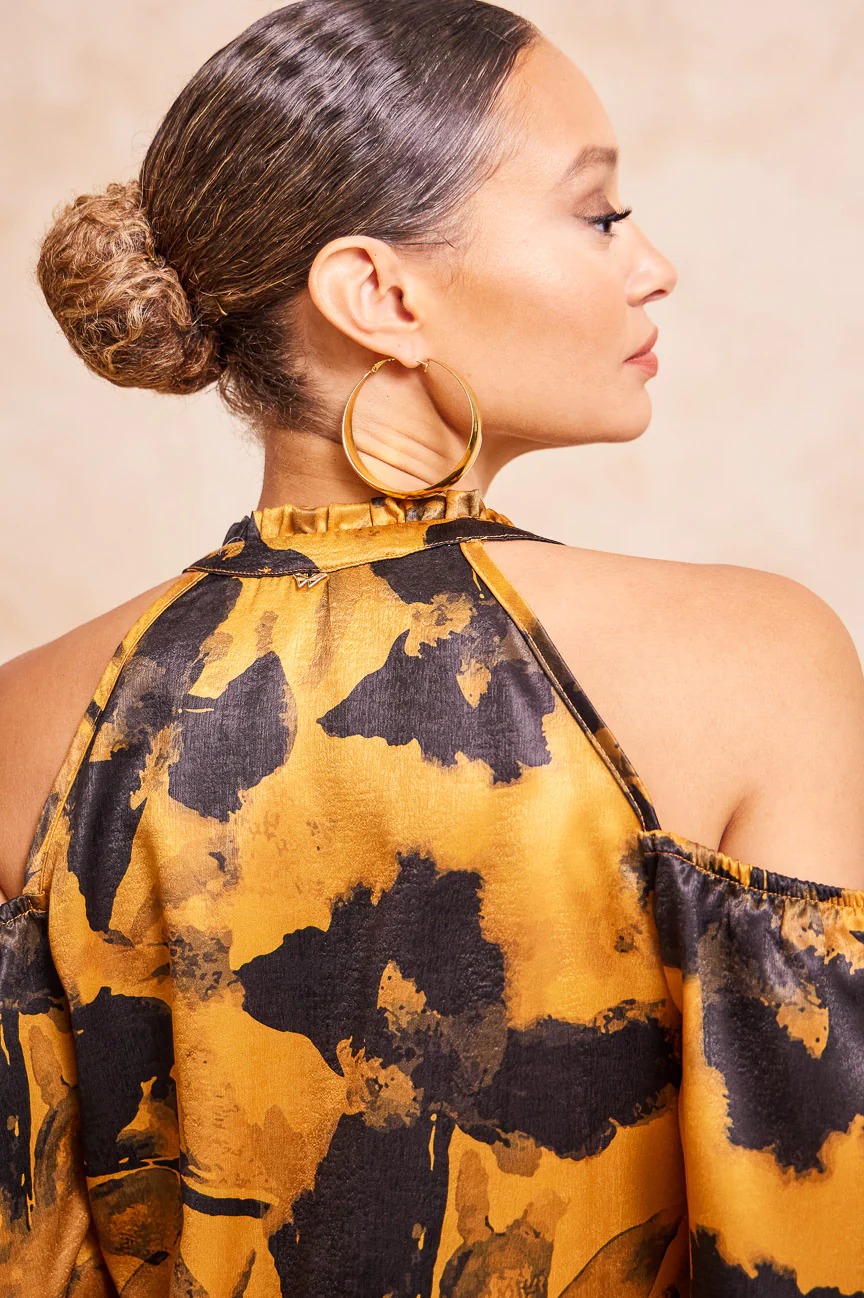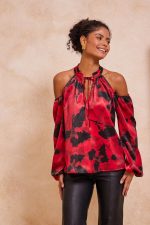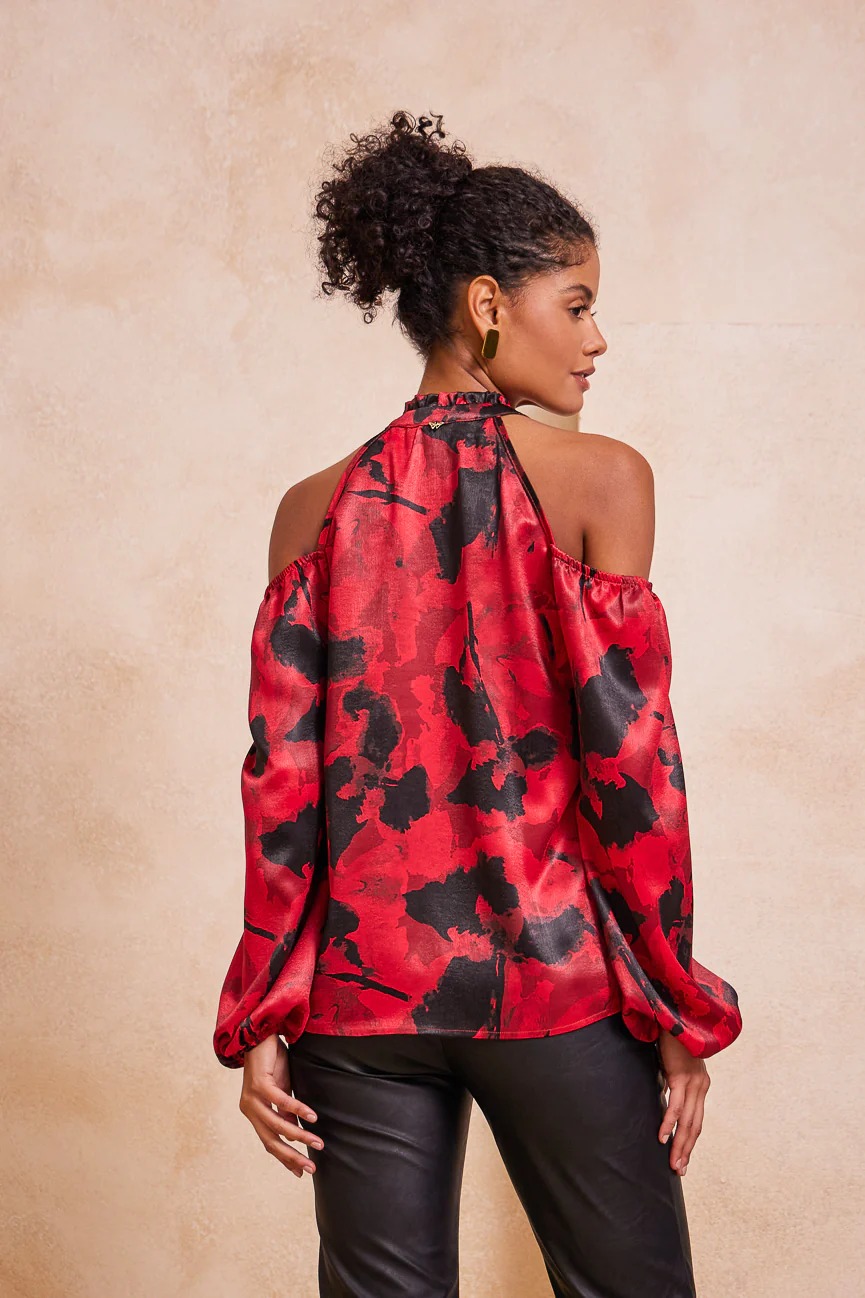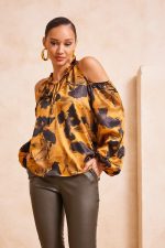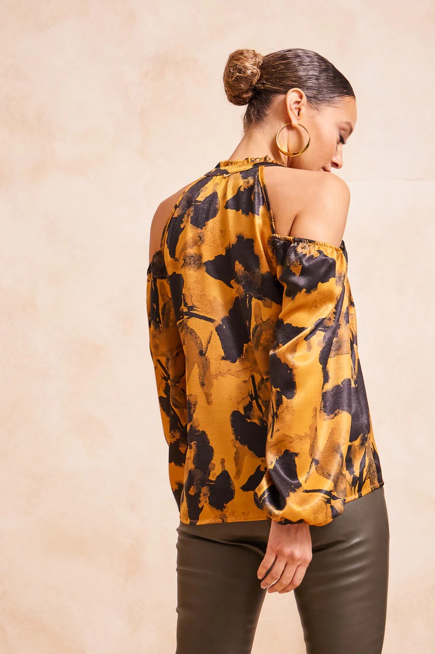 ​Μπλούζα εμπριμέ με ανοιχτούς ώμους. Σταθερό σατέν ύφασμα.