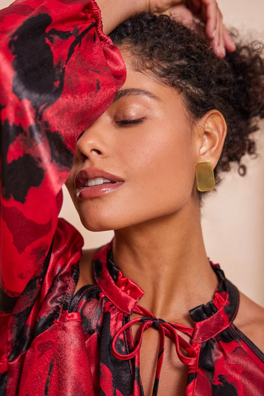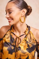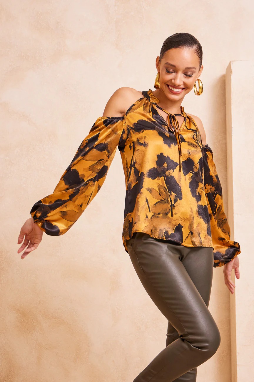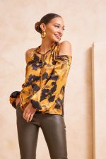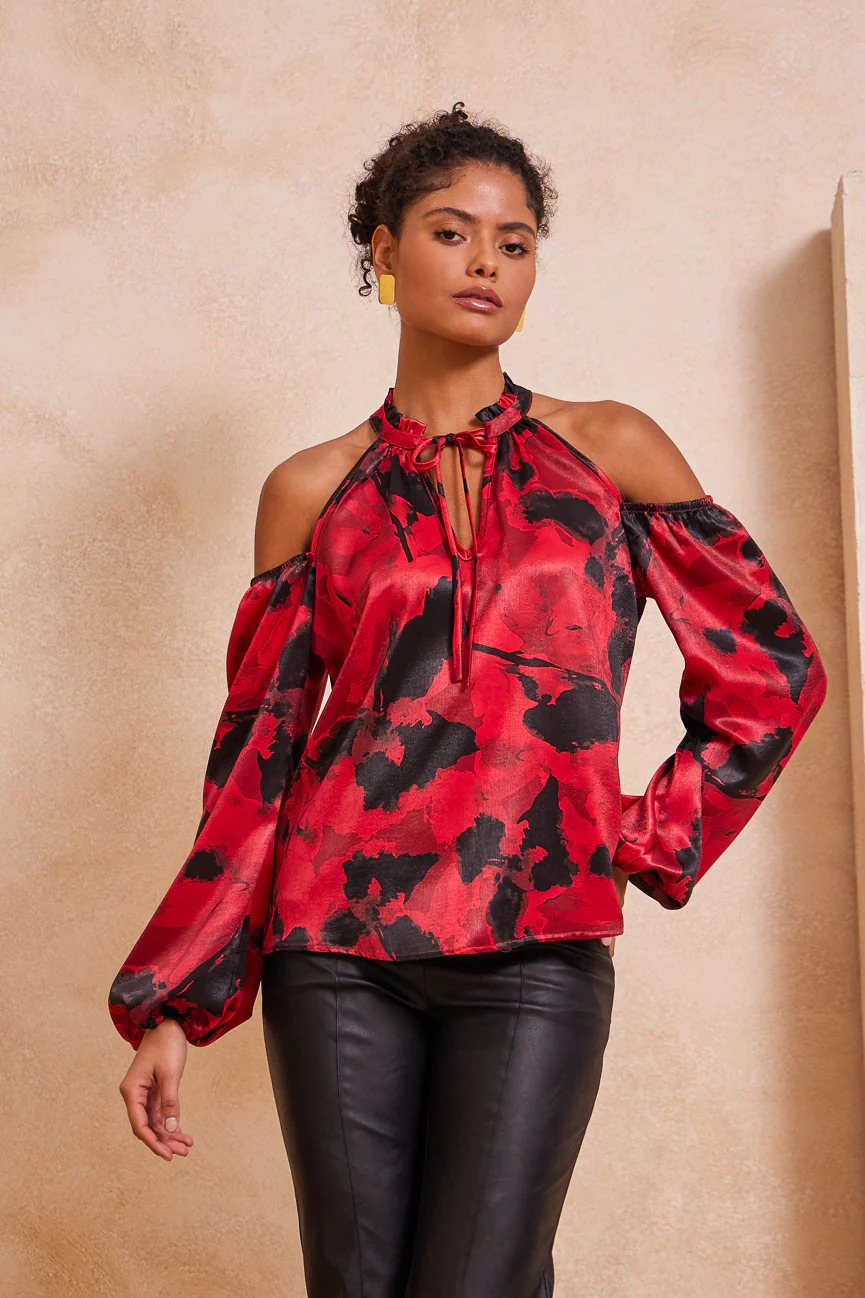 ​Μπλούζα εμπριμέ με ανοιχτούς ώμους. Σταθερό σατέν ύφασμα.