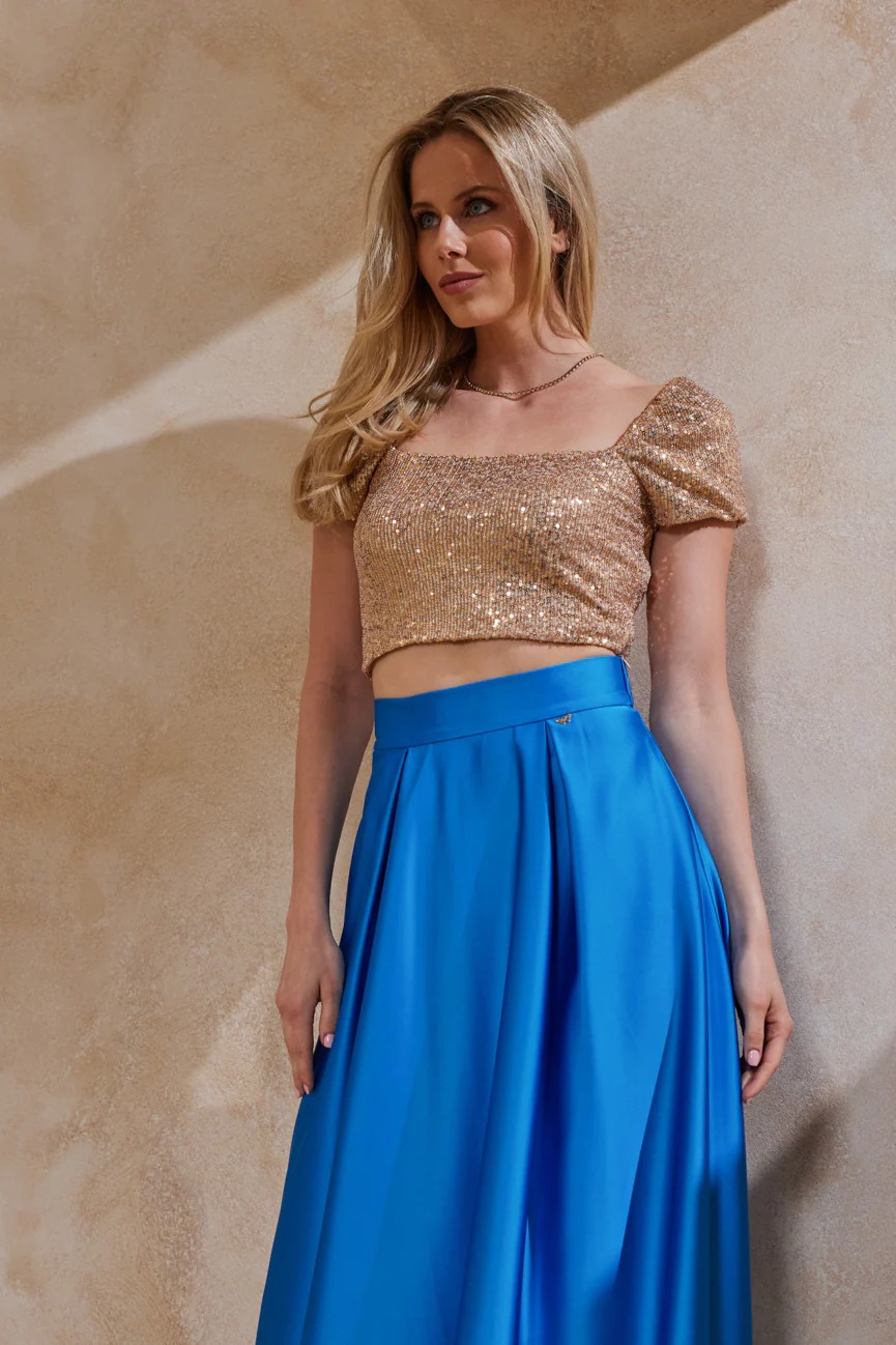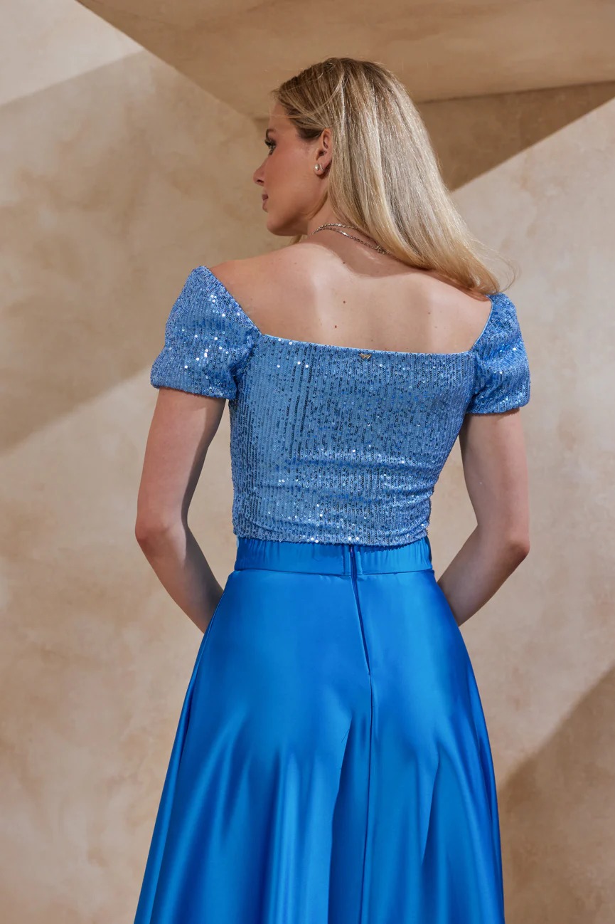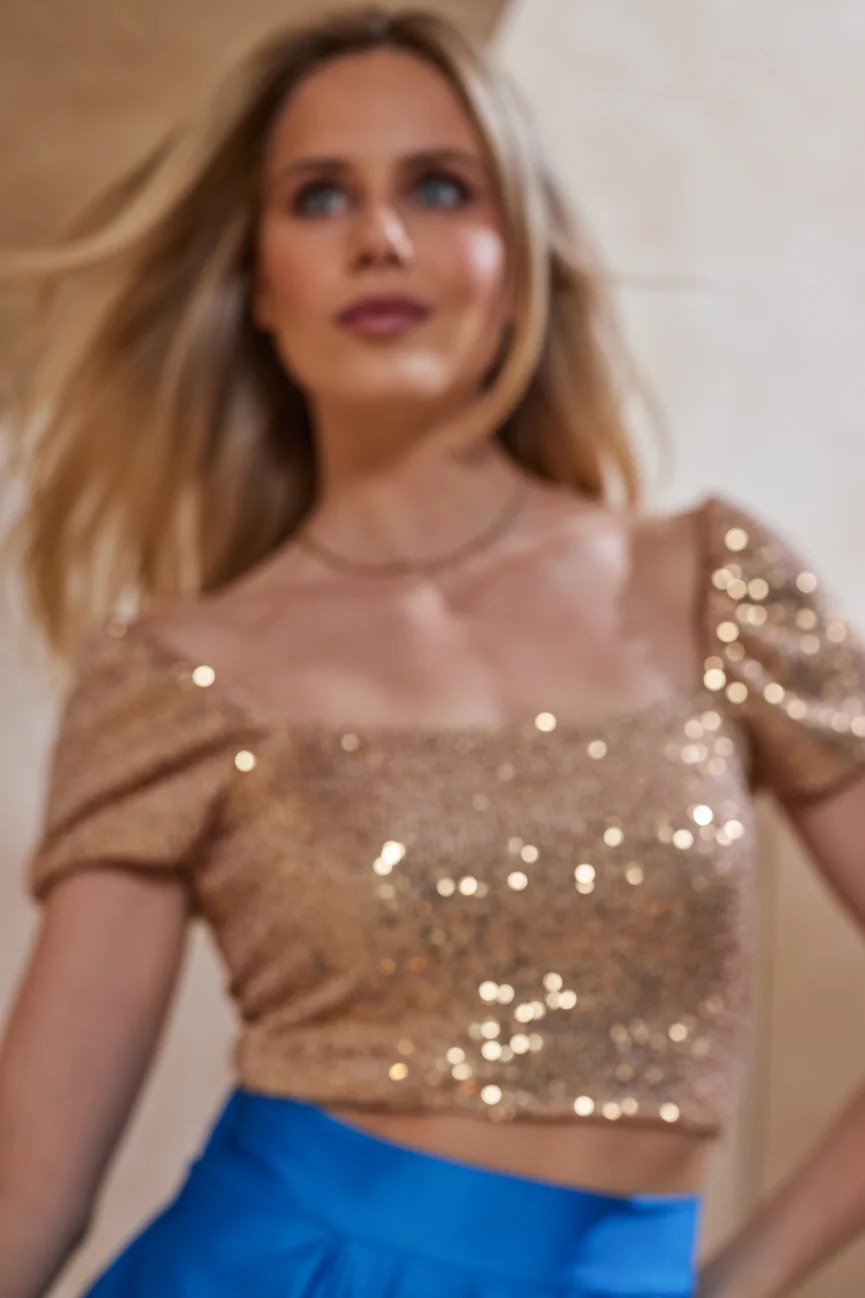 Μπούστο κοντομάνικο. Ελαστικό ύφασμα, παγιέτα. Εφαρμοστό με άνετη κίνηση.