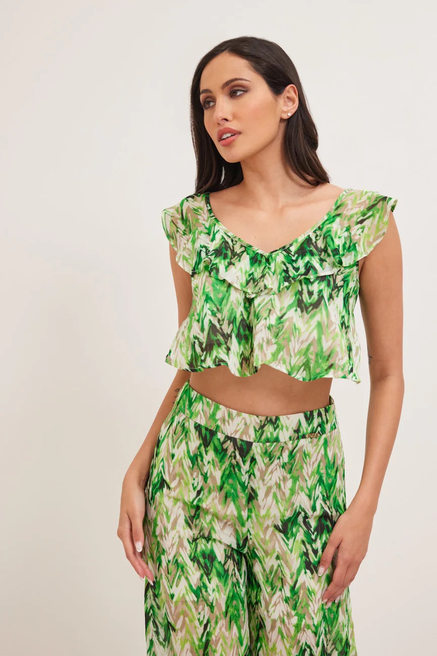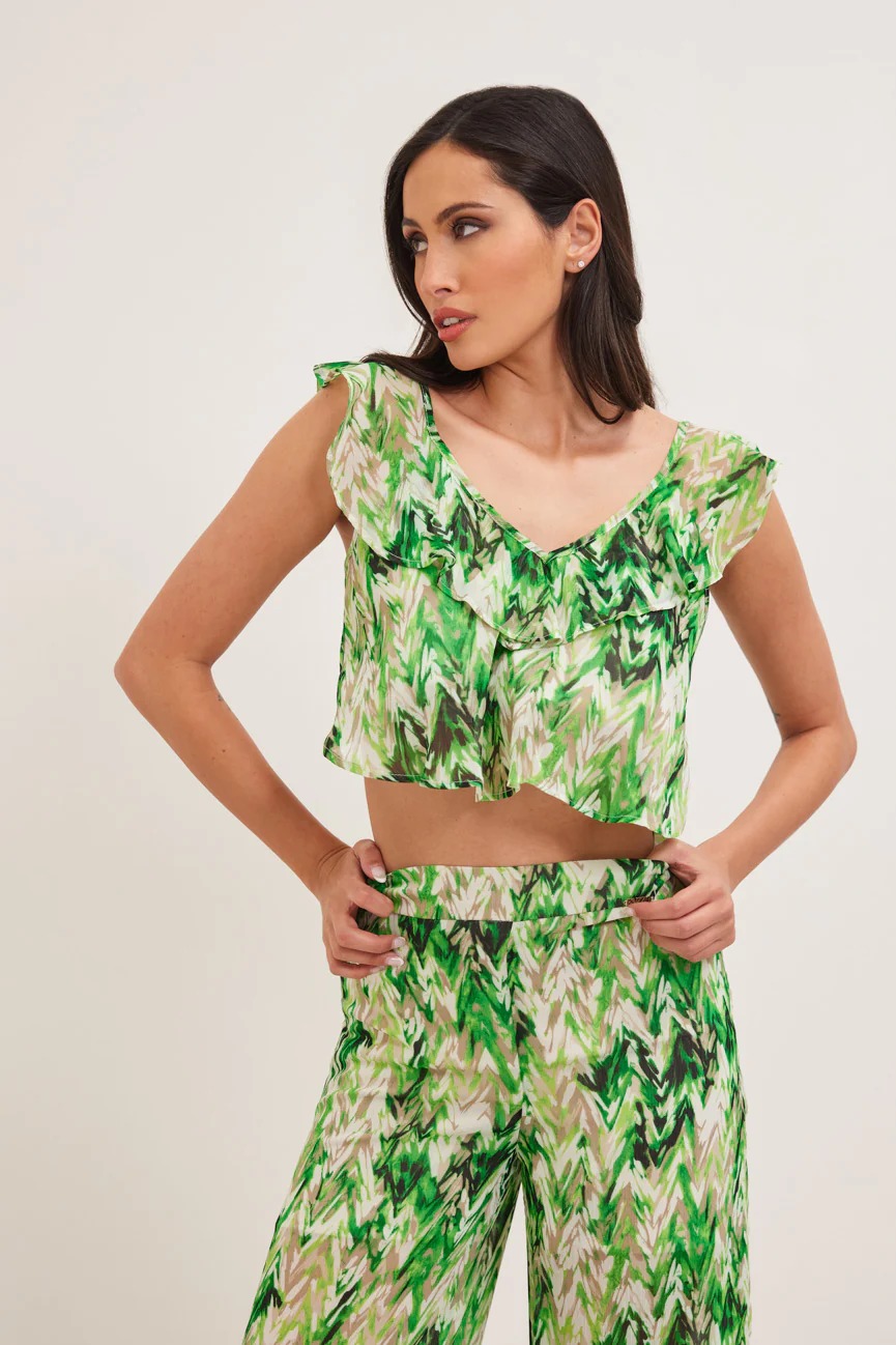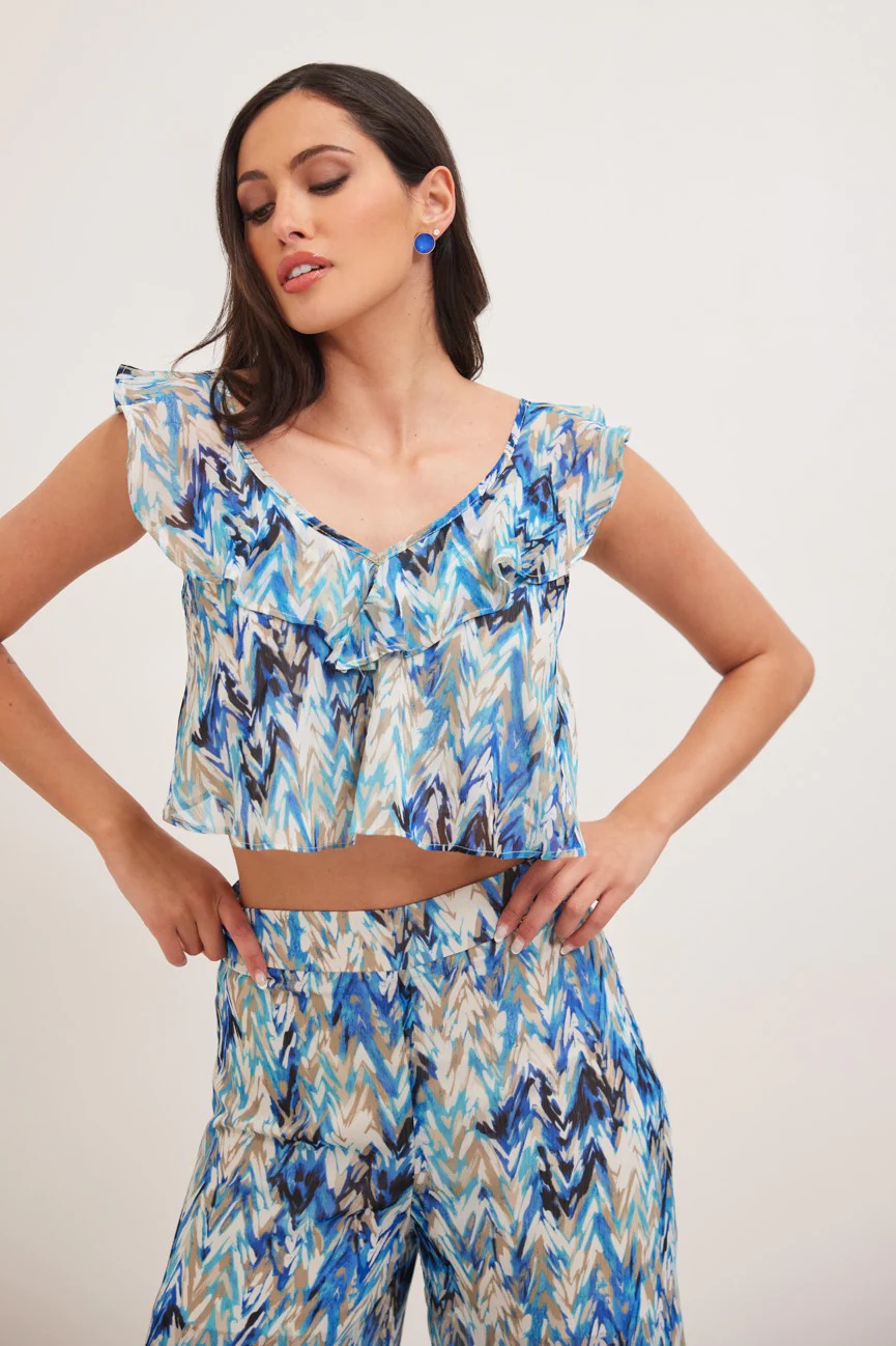 Μπλούζα εμπριμέ. Σταθερό ύφασμα. Ίσια γραμμή με άνετη κίνηση.
