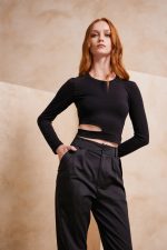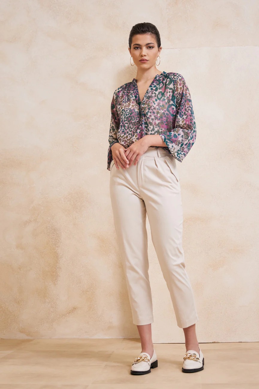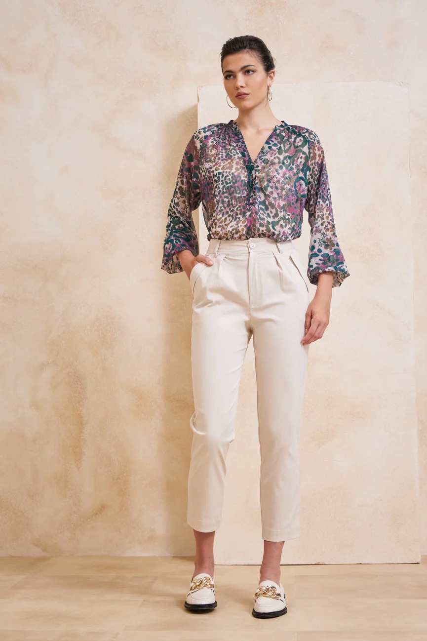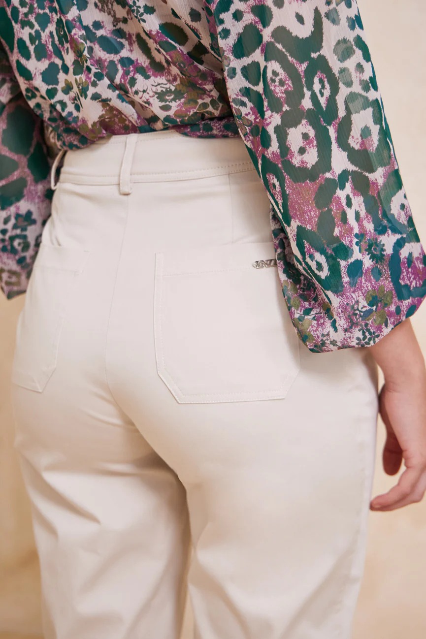Ίσιο με άνετη κίνηση. Κλείσιμο με κουμπί και φερμουάρ εμπρός.