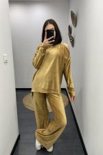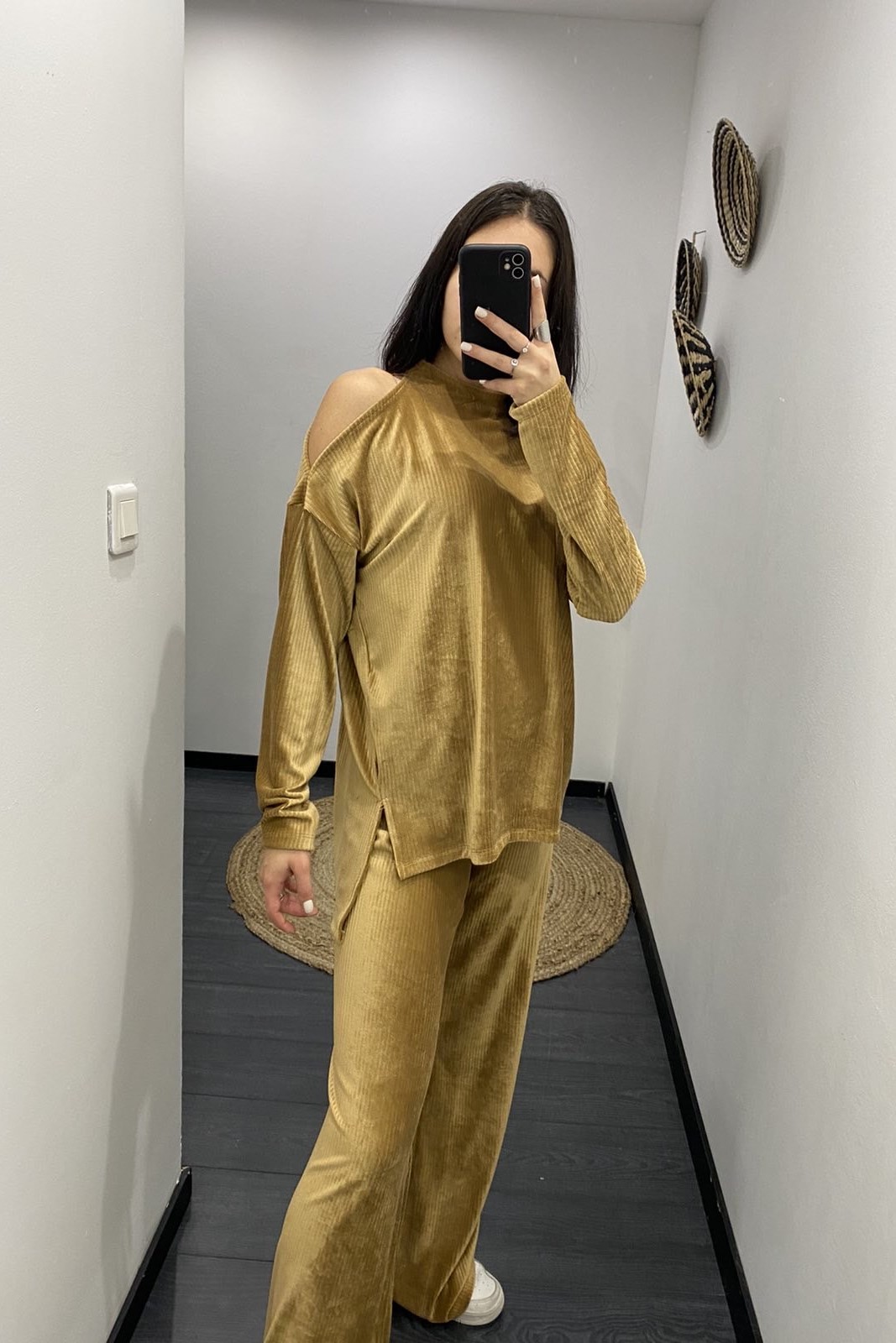 Σετ βελούδινο κοτλέ με παντελόνι και μπλούζα σε άνετη γραμμή με ανοίγματα στους ώμους