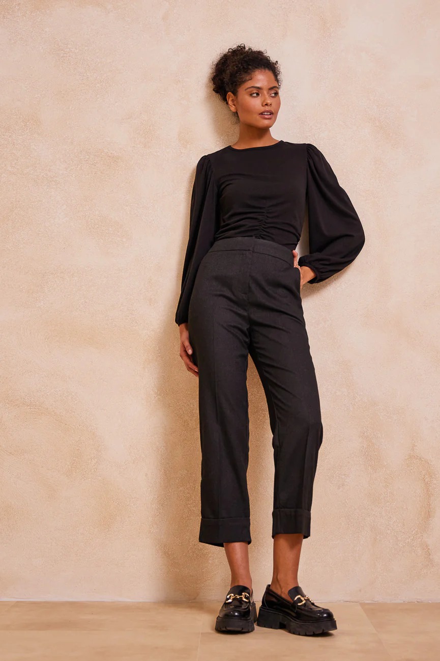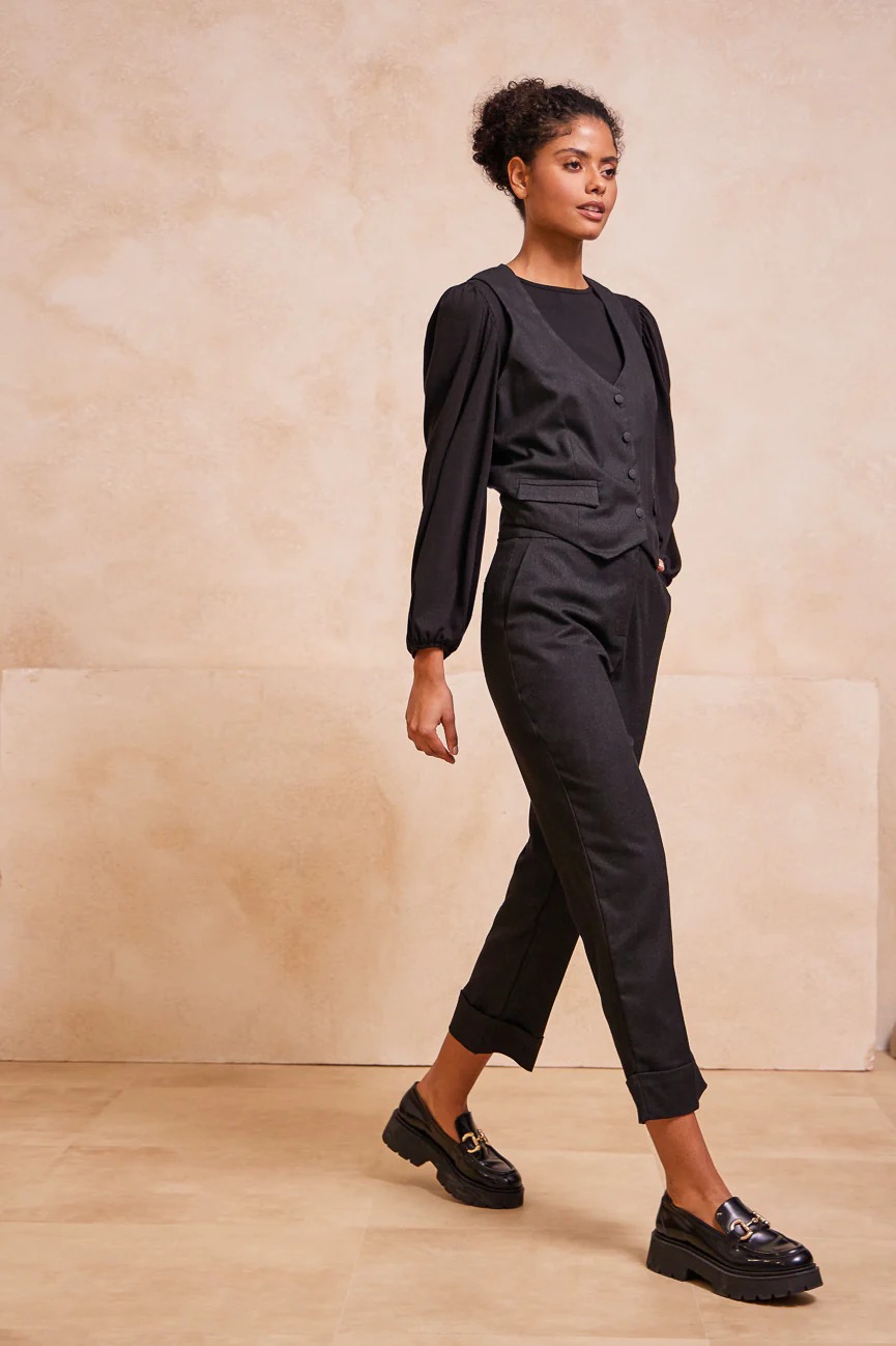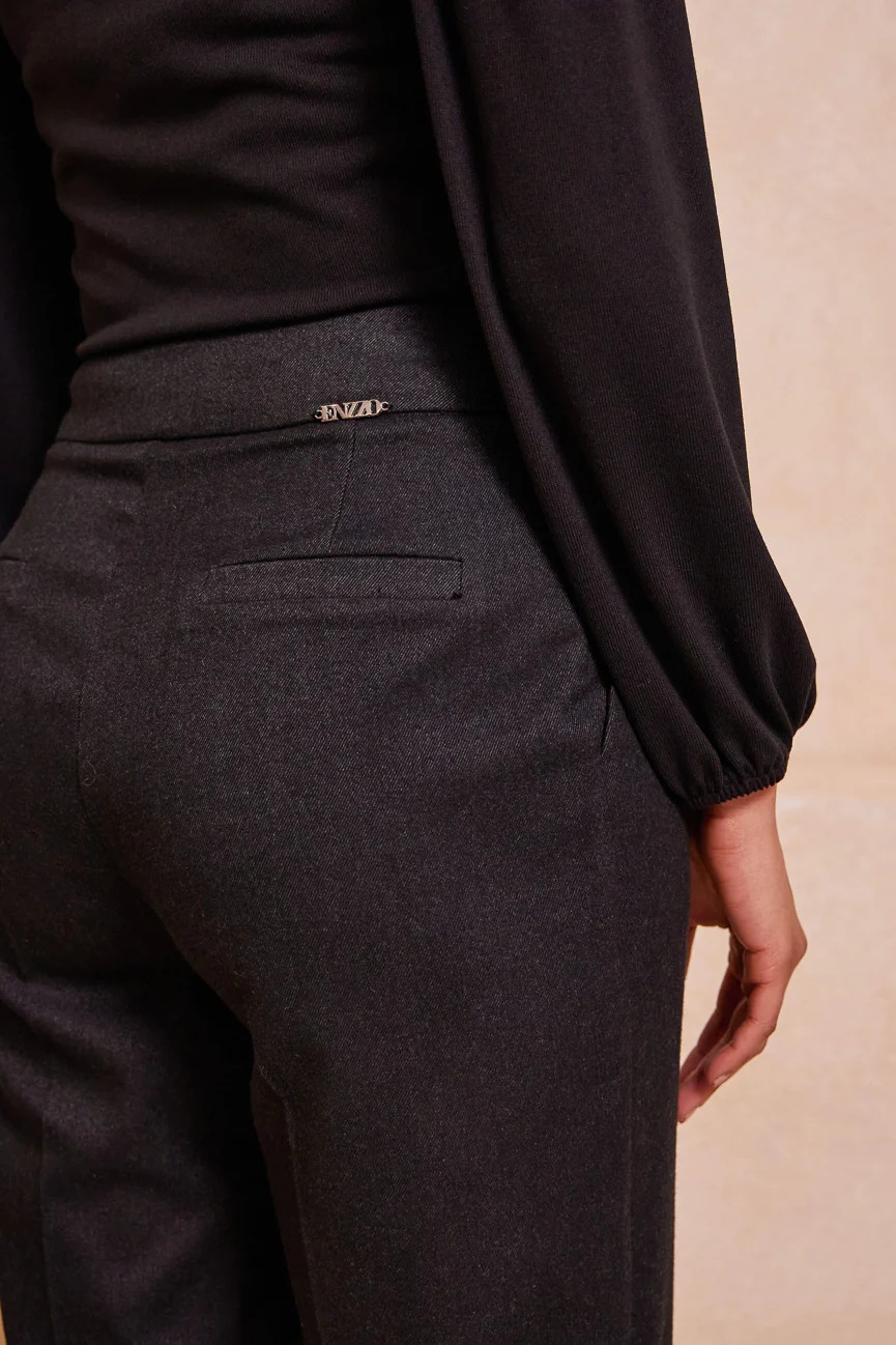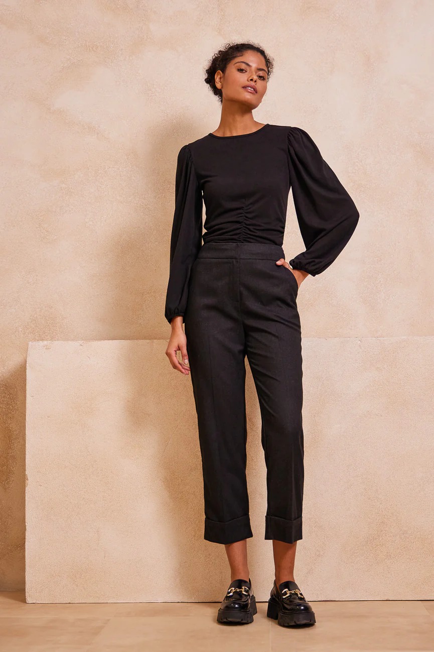 Παντελόνι ίσιο, με ρεβέρ στο στρίφωμα. ‘Ισια γραμμή, με άνετη κίνηση.