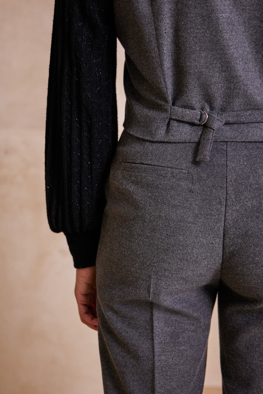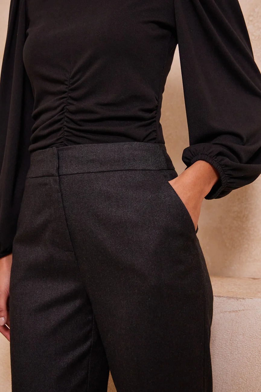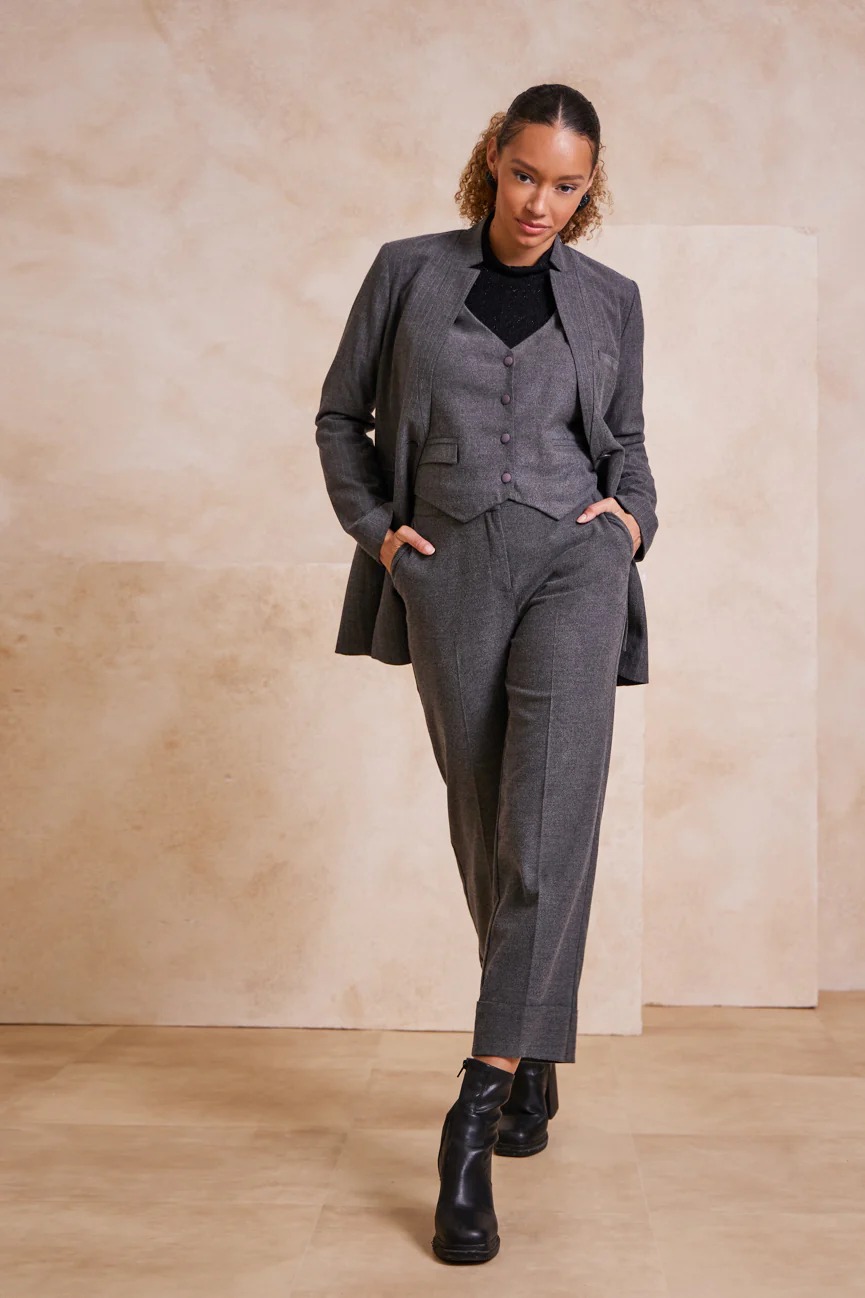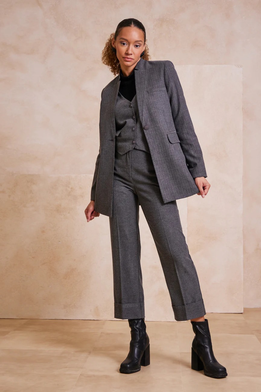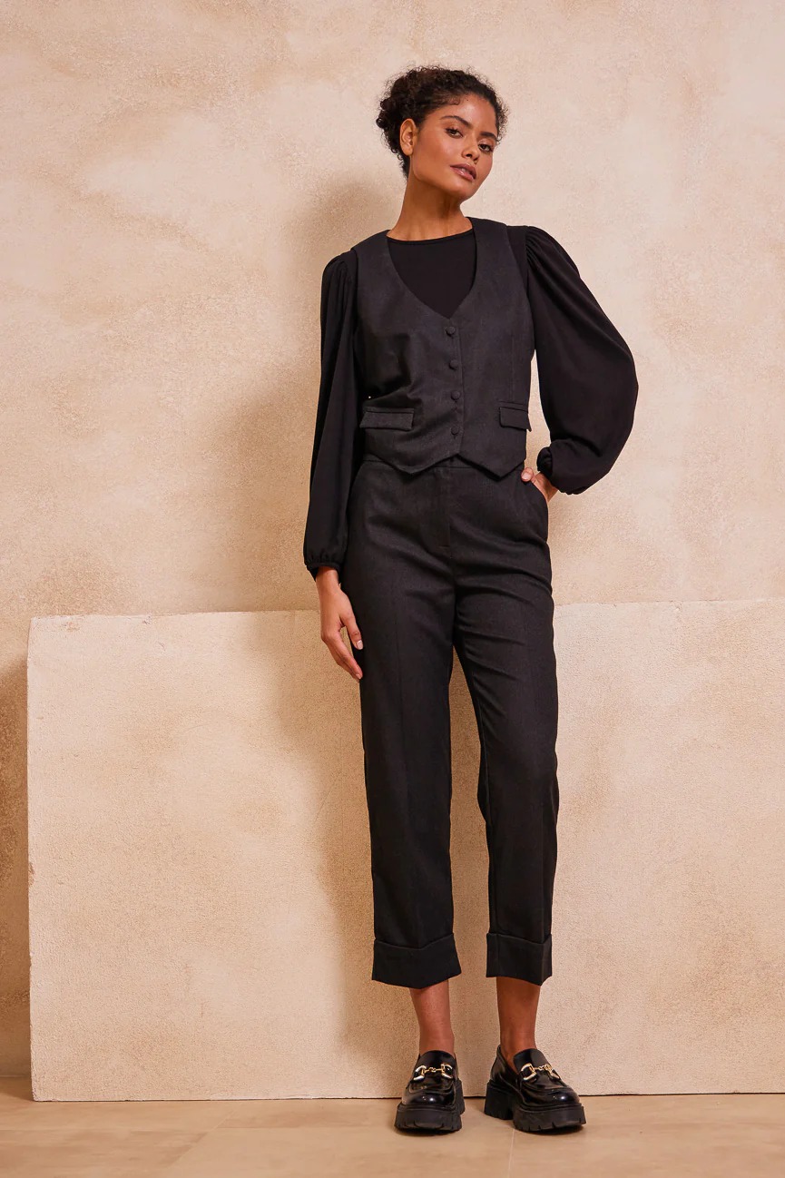 Παντελόνι ίσιο, με ρεβέρ στο στρίφωμα. ‘Ισια γραμμή, με άνετη κίνηση.