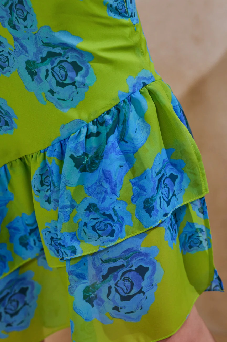 Σχέδιο λοξό. Άνοιγμα στο πλάι. Διπλό βολάν στο τελείωμα.