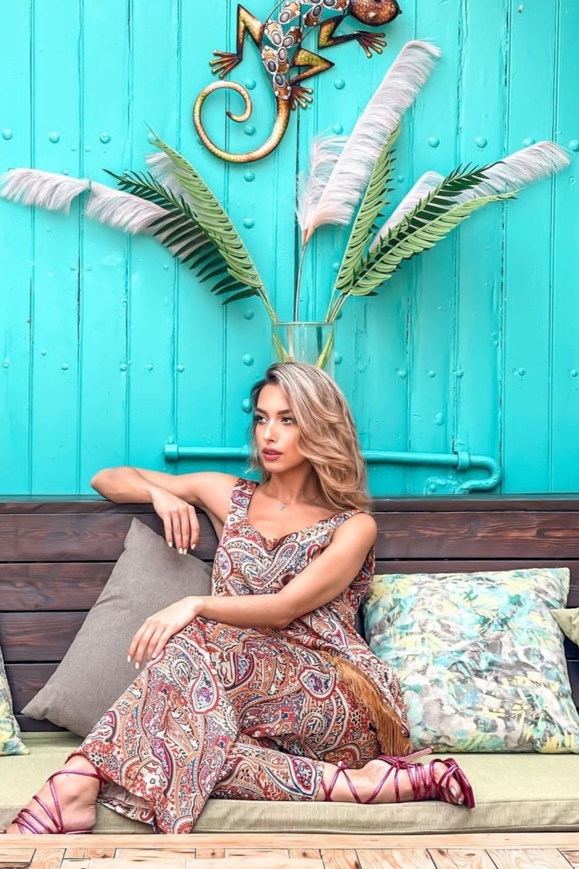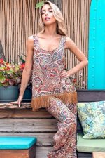 Σατέν εμπριμέ σετ μπλούζα με παντελόνα. Άνετη γραμμή.