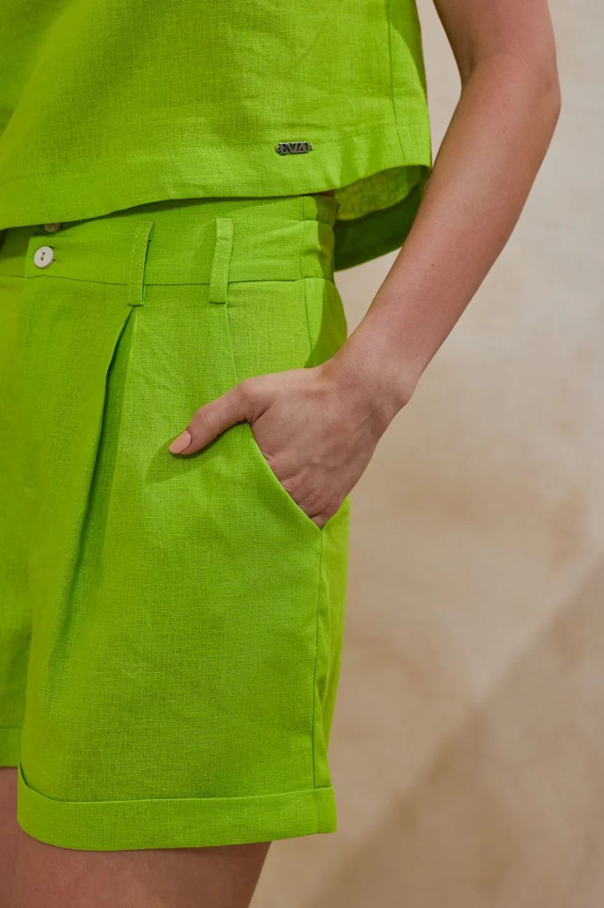 Σορτς μονόχρωμο. Σταθερό ύφασμα, λινό. Ίσια γραμμή με άνετη κίνηση.