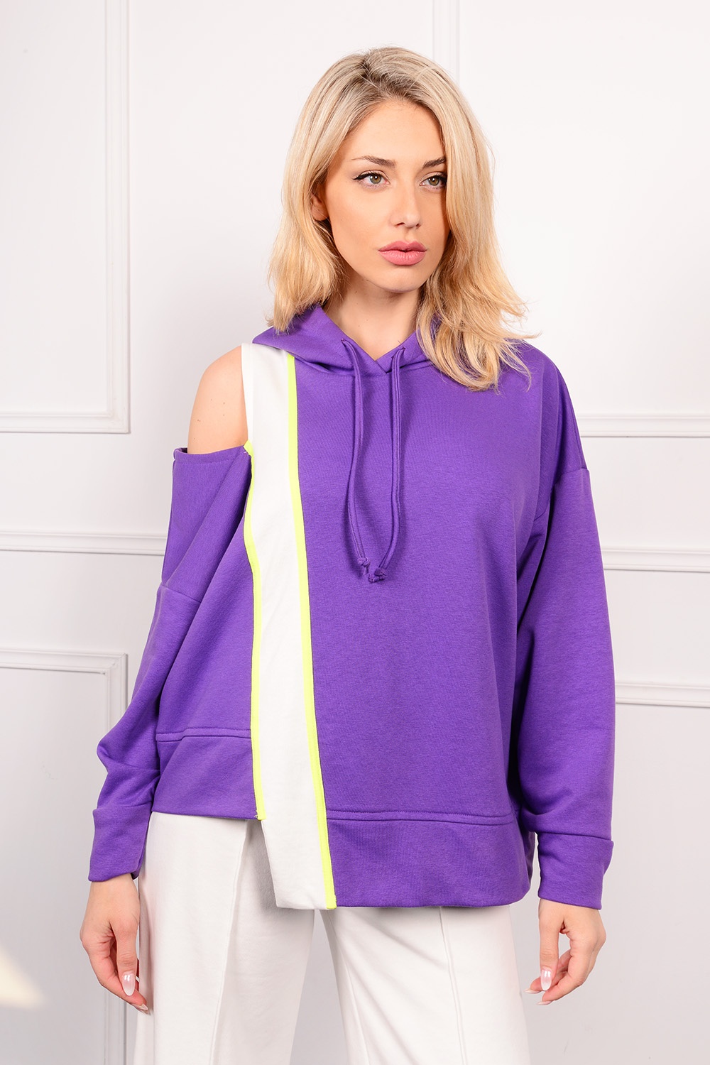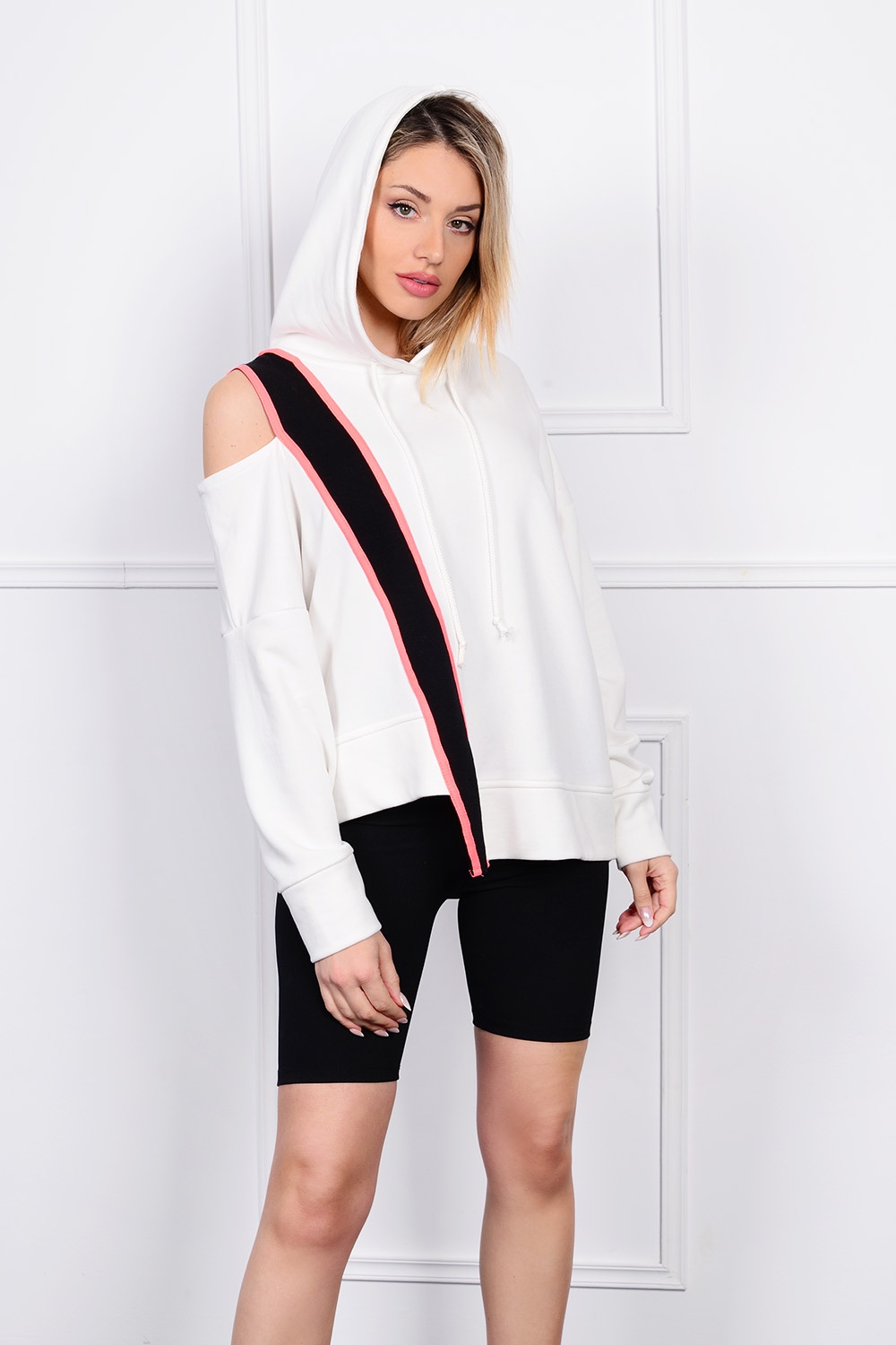 Ασύμμετρη μπλούζα με με κουκούλα με ροζ λεπτομέρειες. Άνετη γραμμή