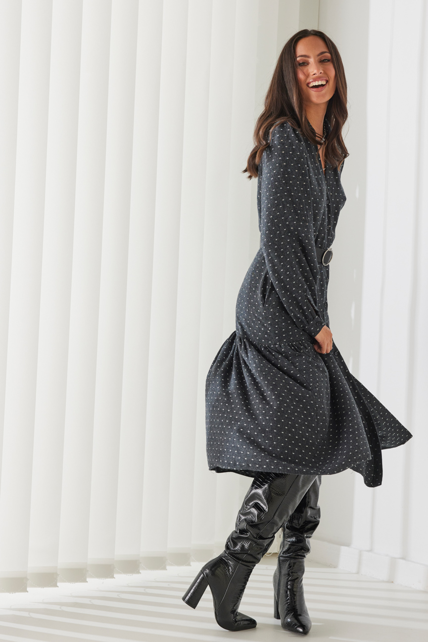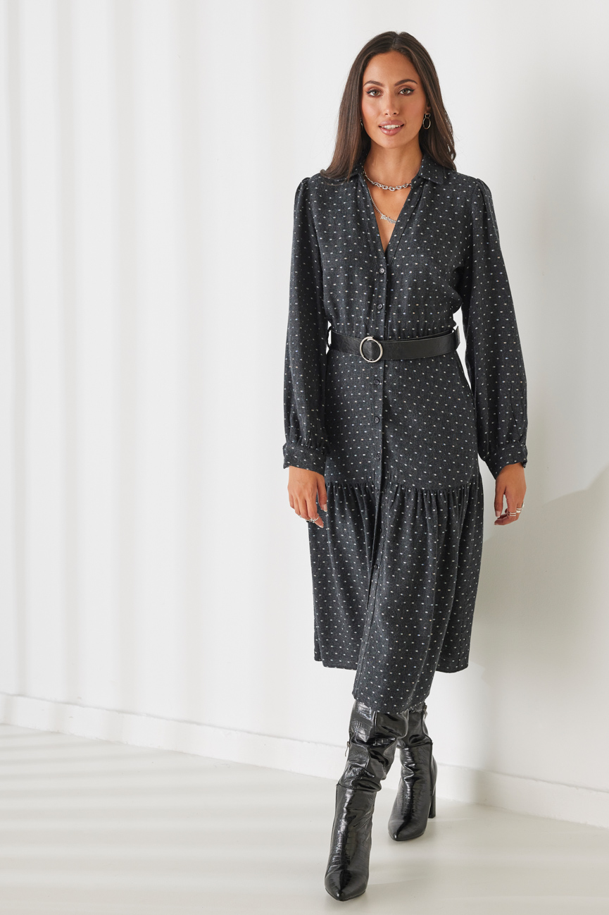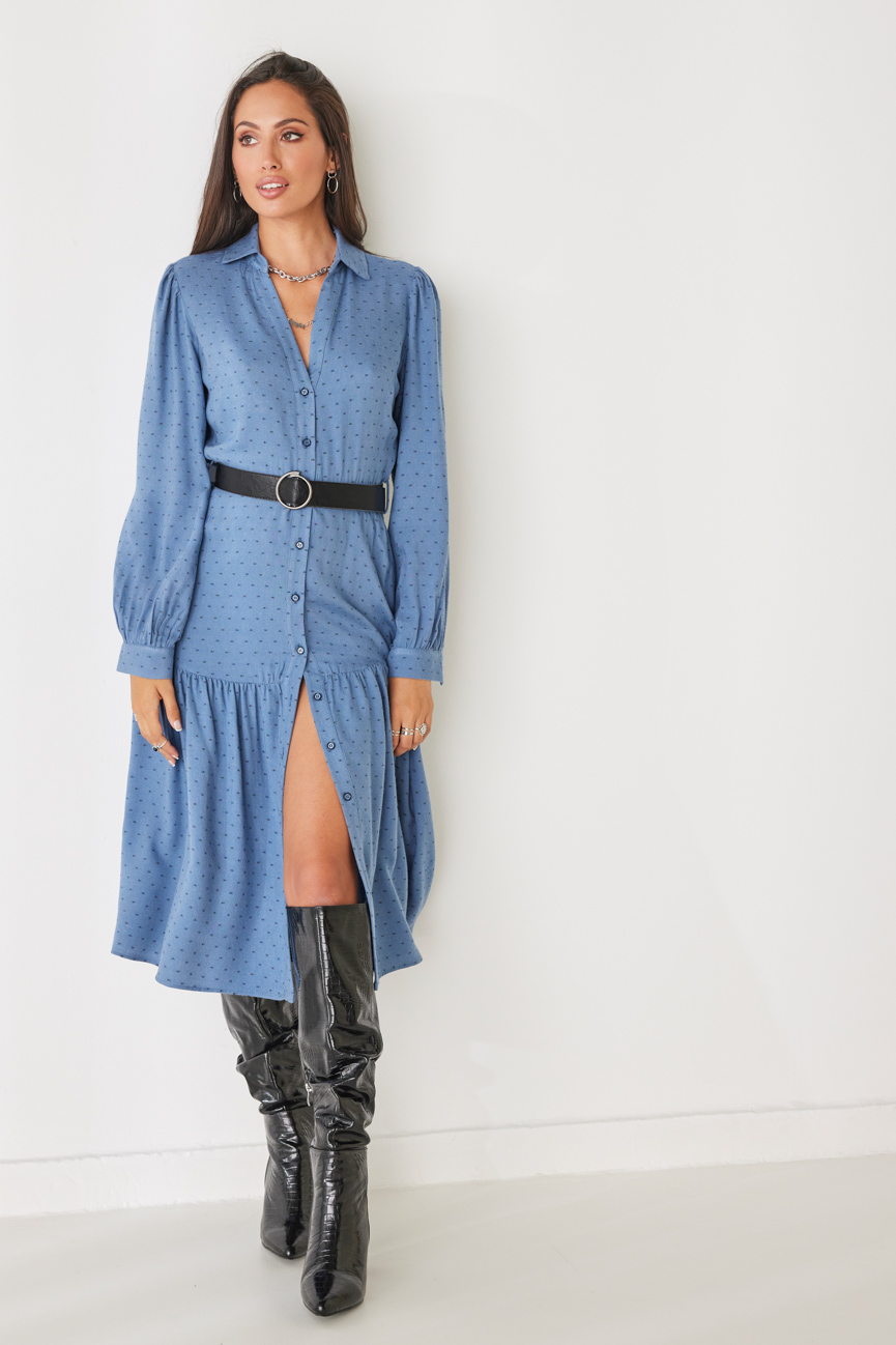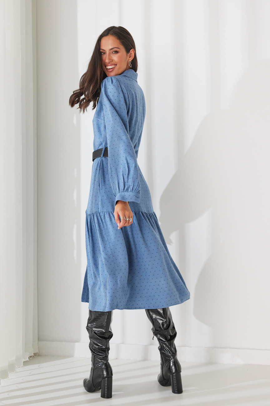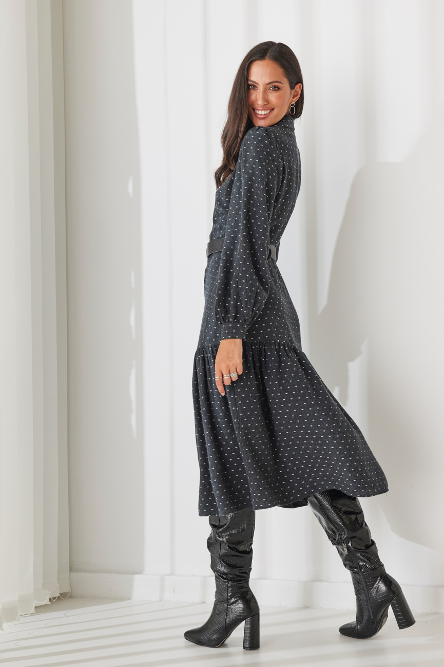 Σεμιζιέ στιλ με βολάν τελείωμα. Ζώνη δερματίνη με μεταλλική αγκράφα.