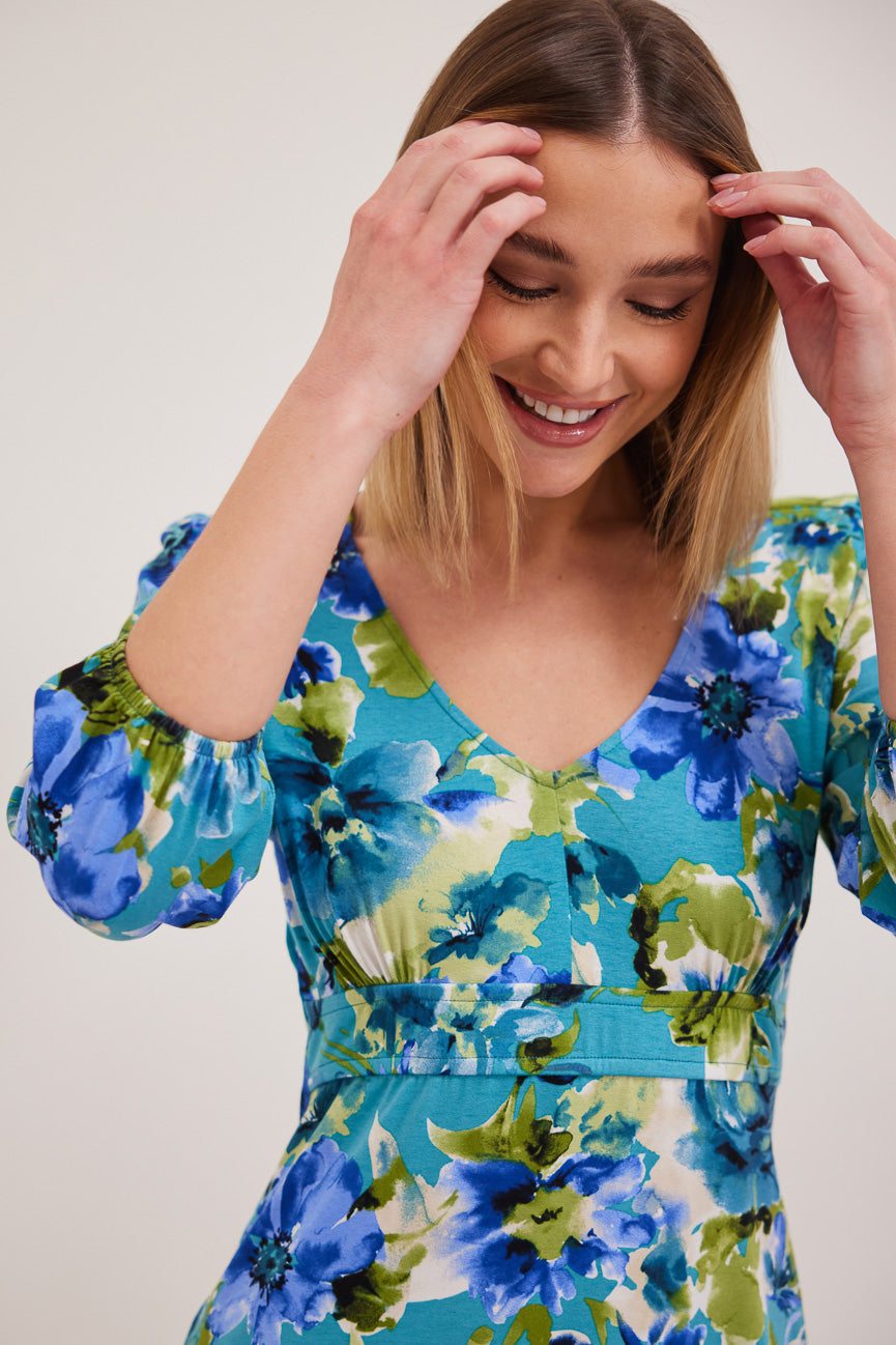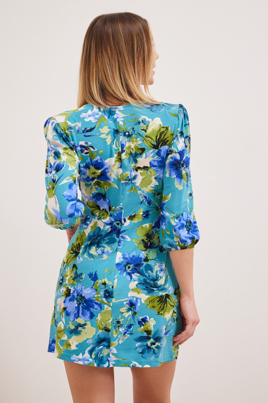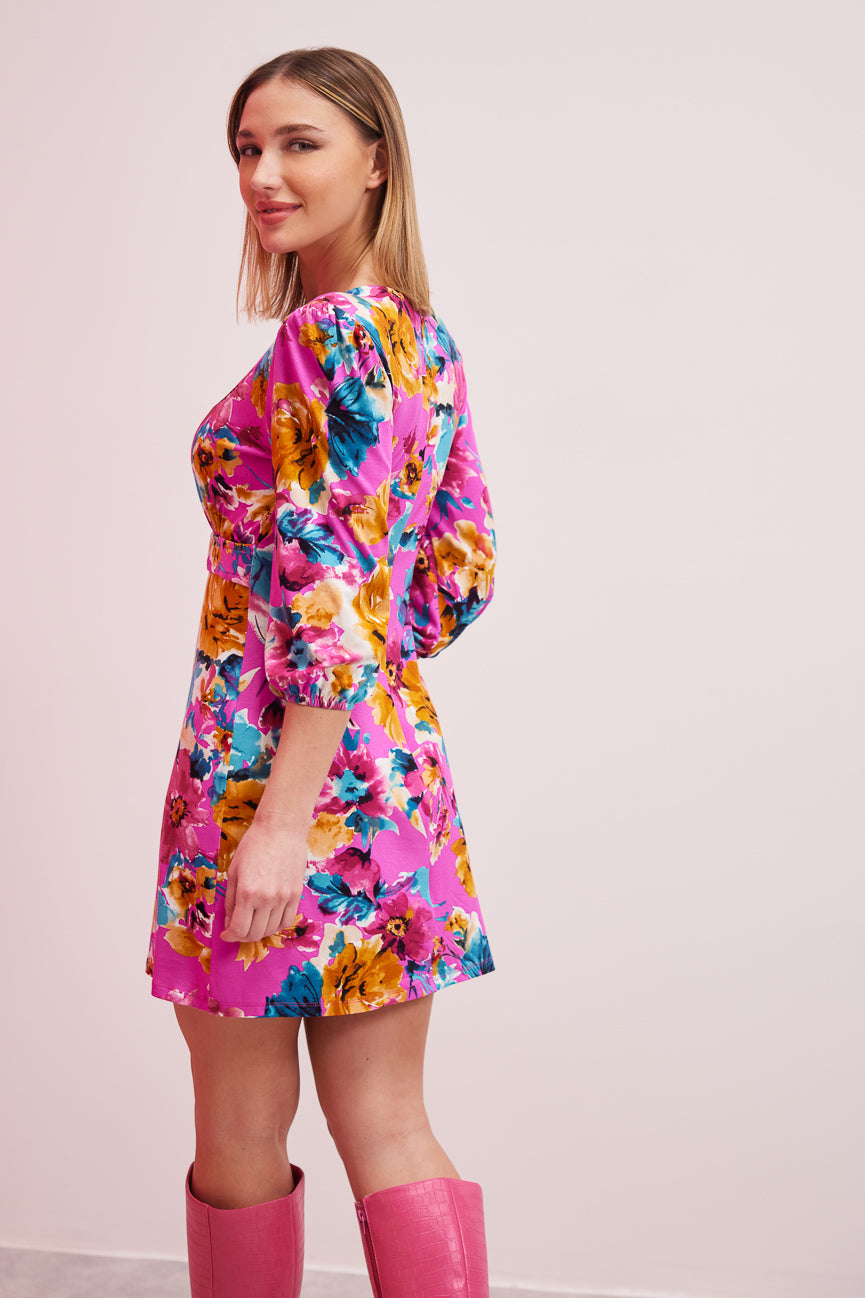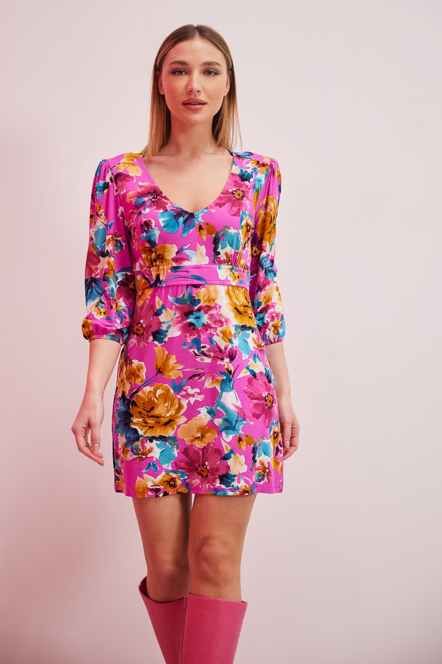 Φόρεμα μίνι φλοράλ. Ελαστικό ύφασμα, βισκόζη. Α γραμμή άνετη κίνηση.