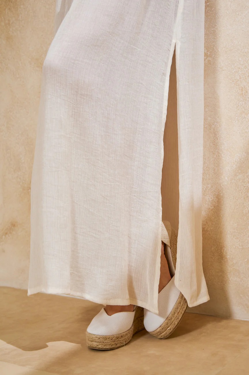 Φόρεμα μάξι. Σταθερό ύφασμα, βισκόζη. Τσαλακωτή γκοφρέ υφή.