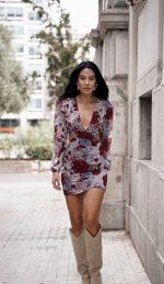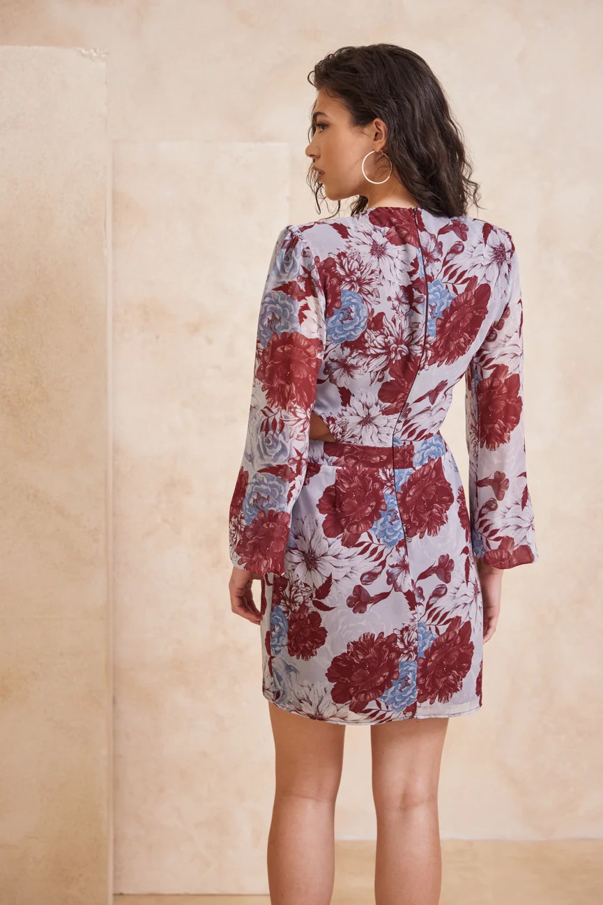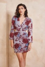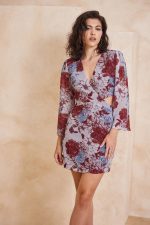 Φόρεμα μίνι φλοράλ μακρυμάνικο. Σταθερό ύφασμα, μουσελίνα. Ίσια γραμμή με άνετη κίνηση.