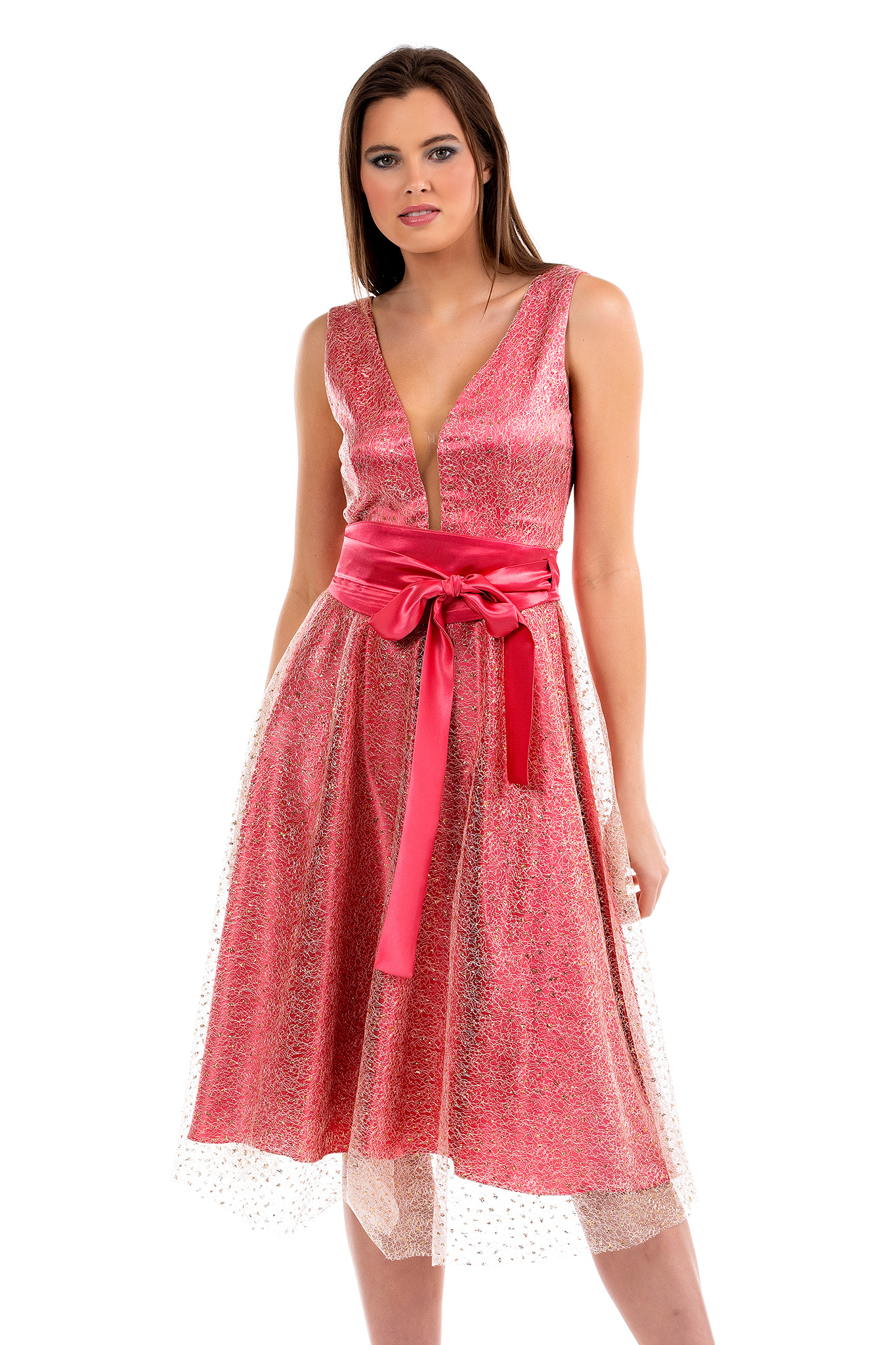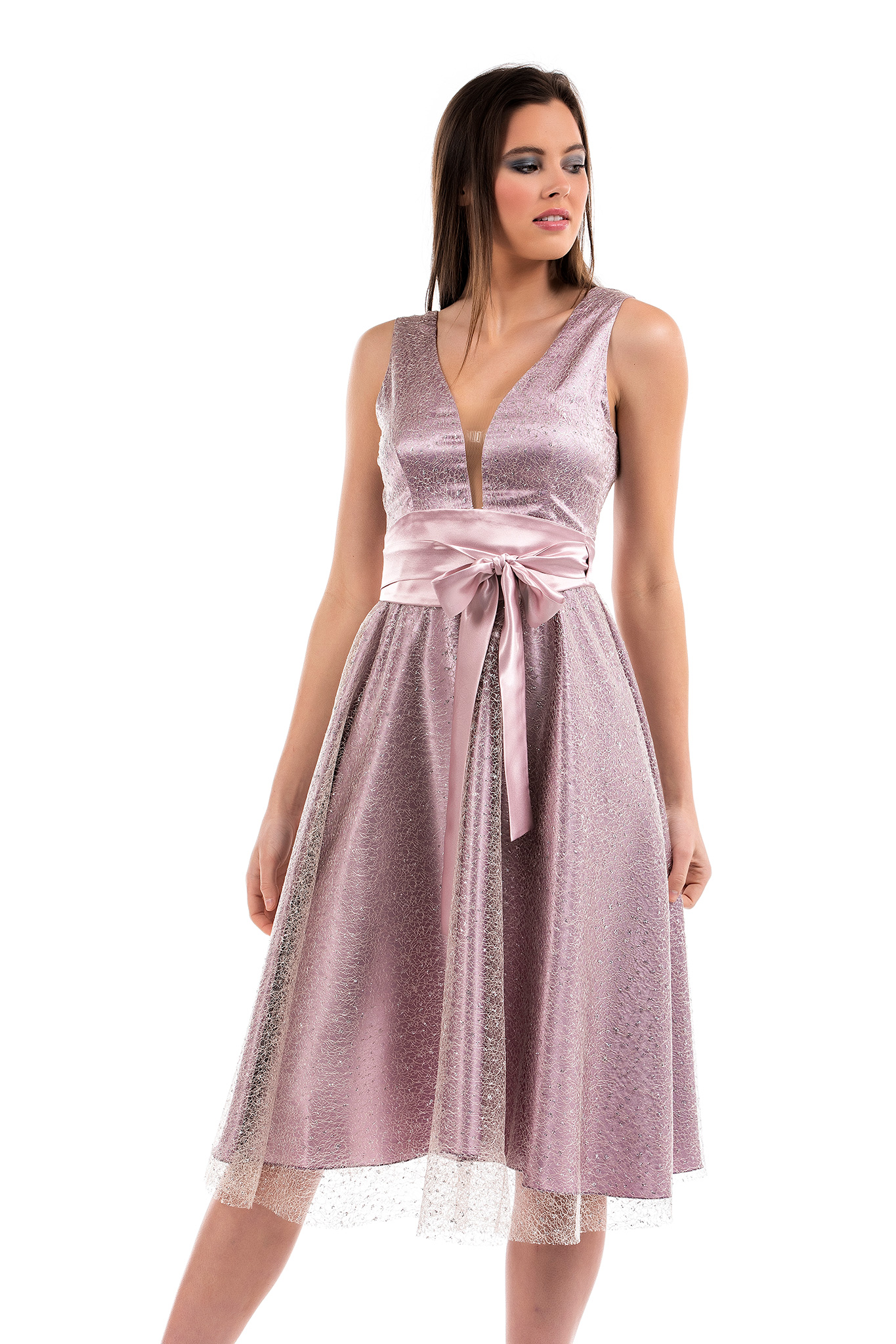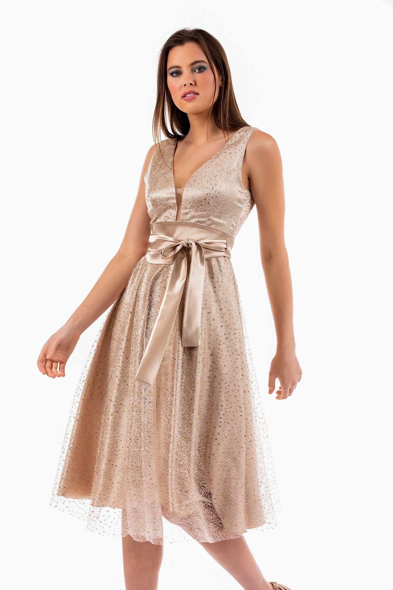 Φόρεμα midi σε glitter δίχτυ με θηλυκό ντεκολτέ, ανοιχτή πλάτη, φερμουάρ πίσω και ζώνη σατέν που δένει.