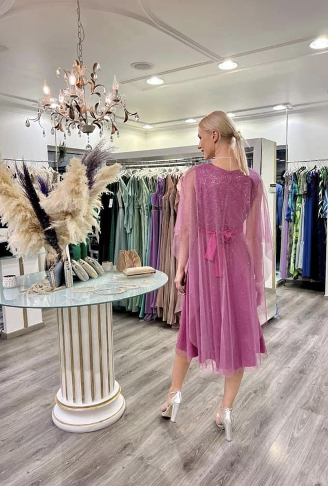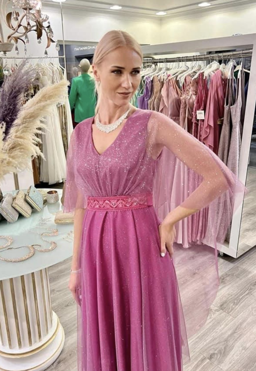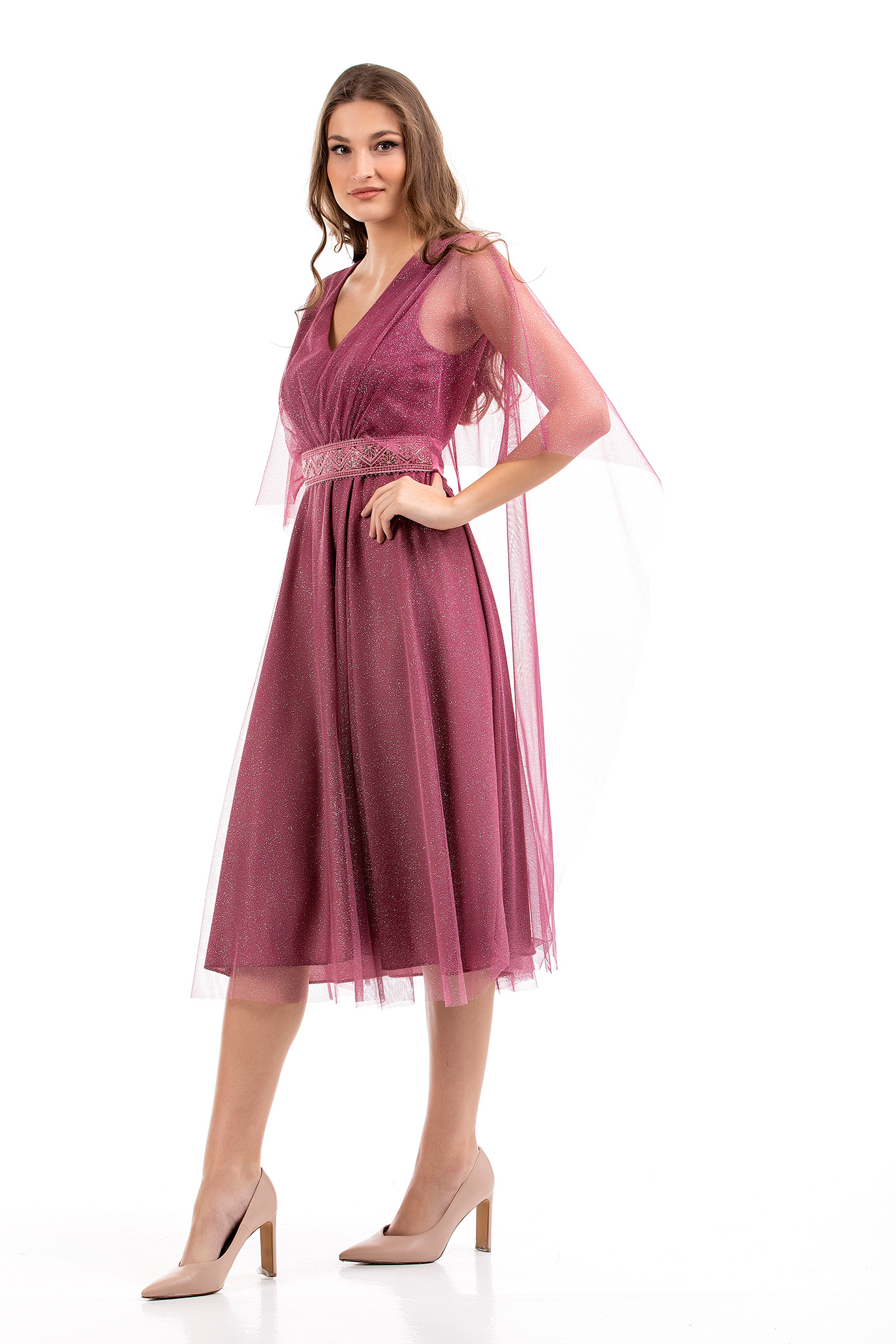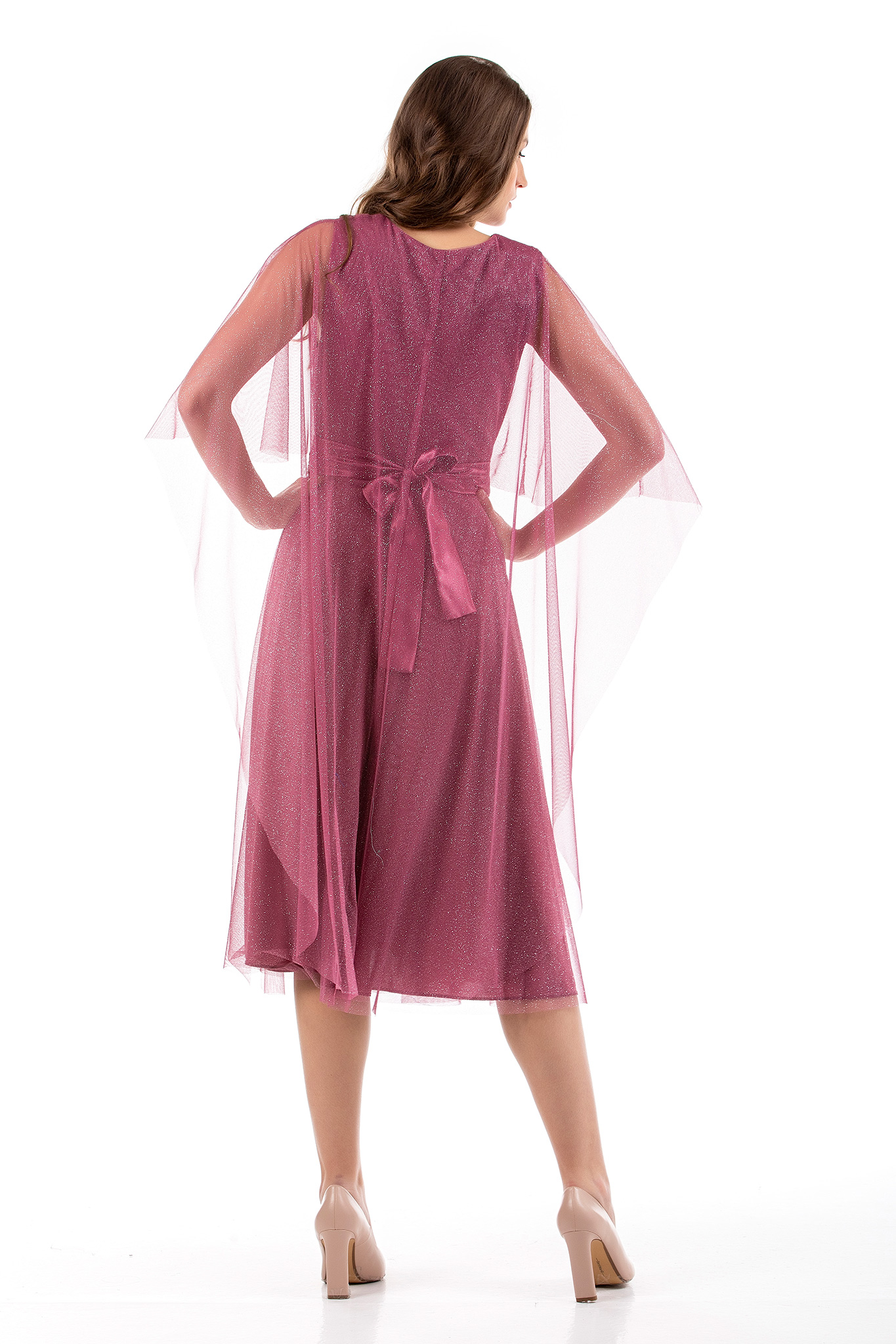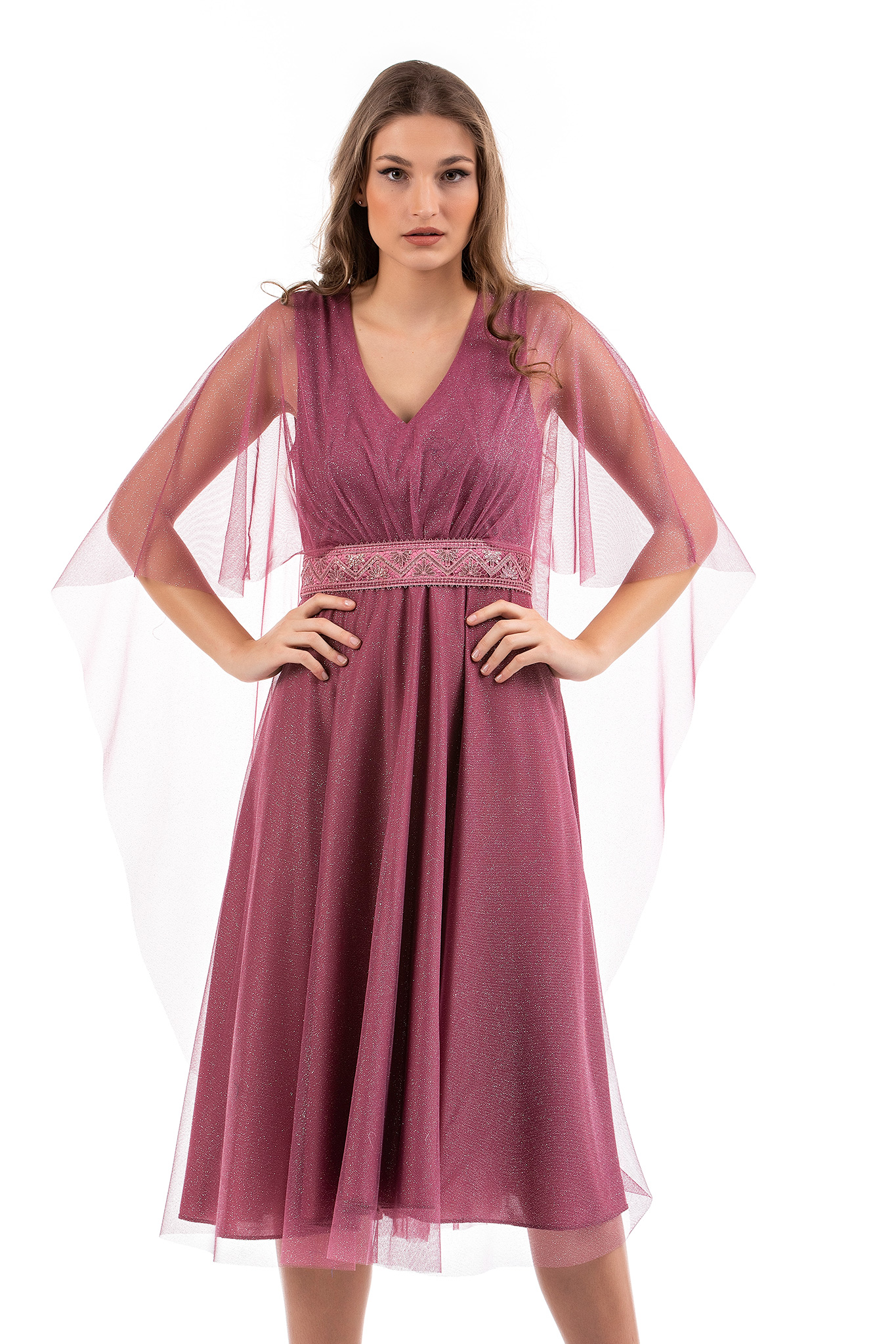 Φόρεμα midi σε lurex τούλι ύφασμα με σχέδιο V εμπρός και λαιμόκοψη πίσω,