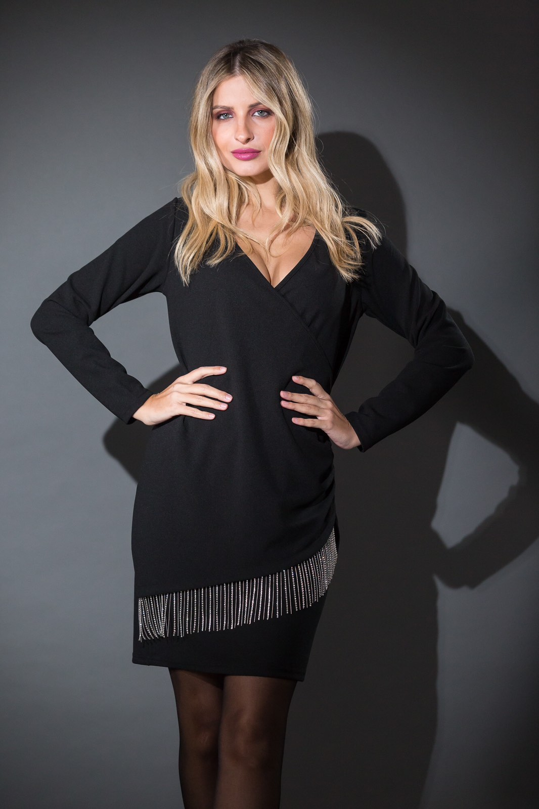 Φόρεμα mini κρουαζέ, με κρόσια από στρας