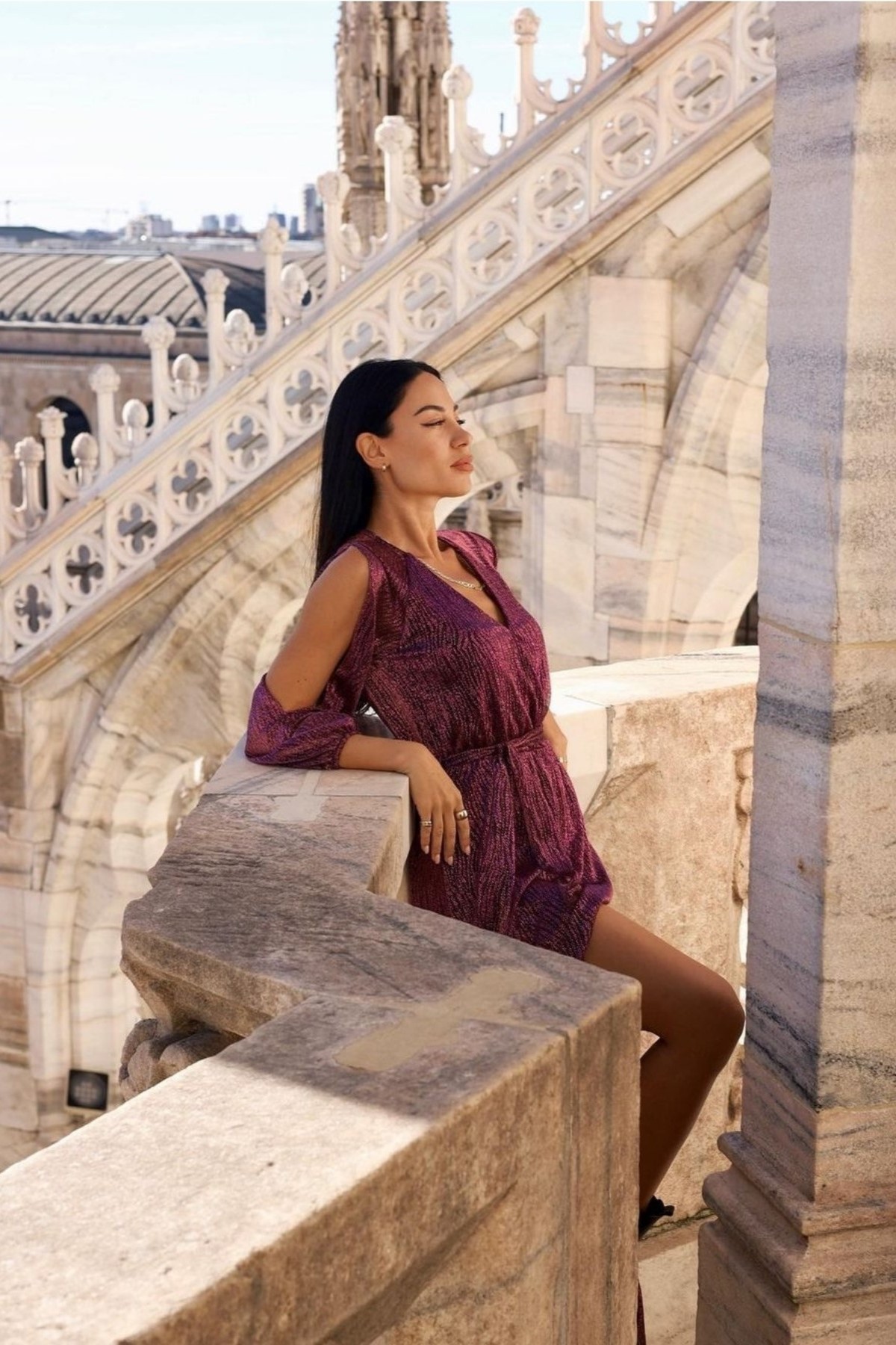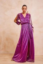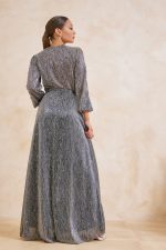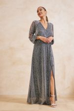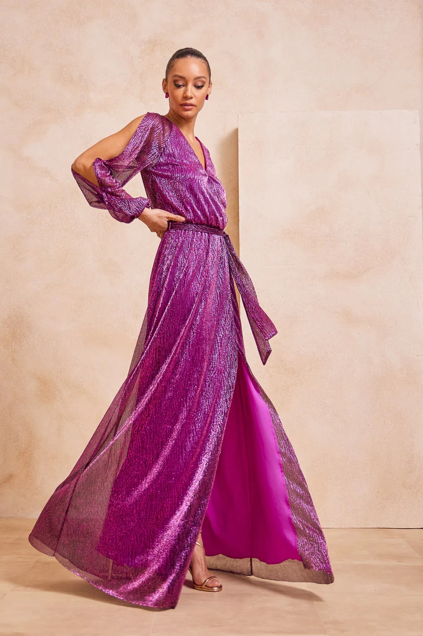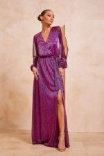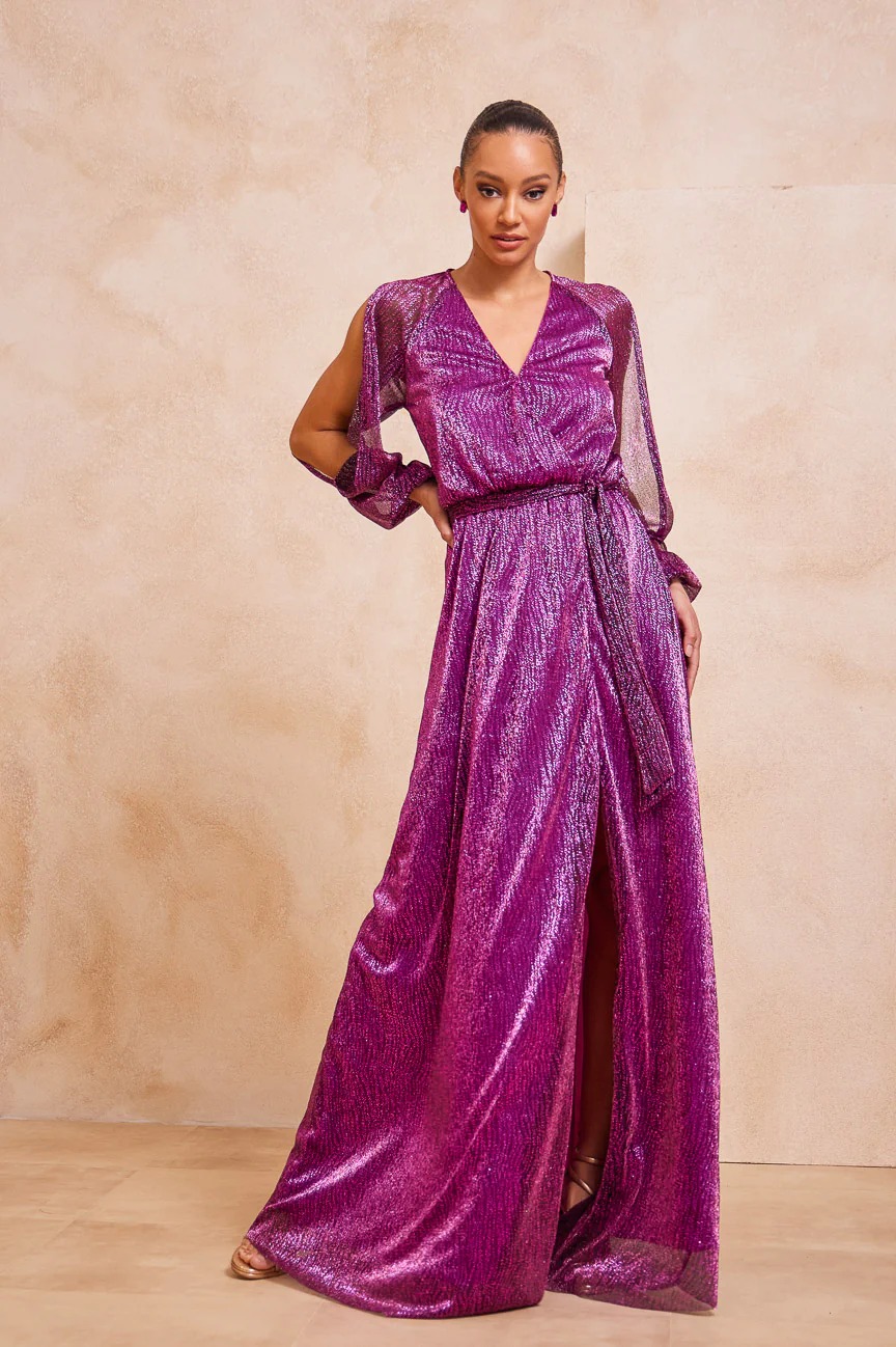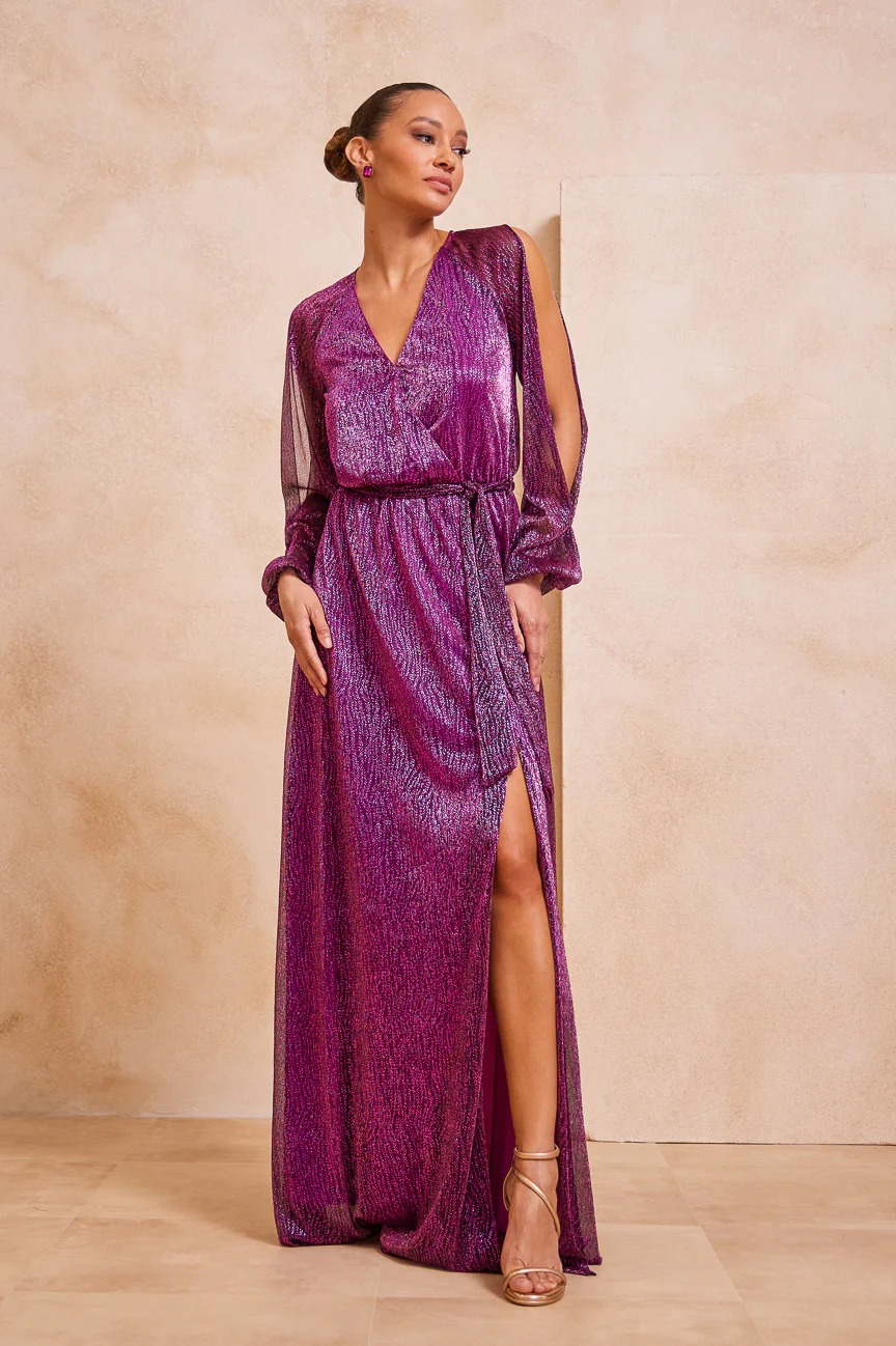 Φόρεμα μάξι με άνοιγμα μπροστά. Σταθερό ύφασμα, μεταλιζέ.